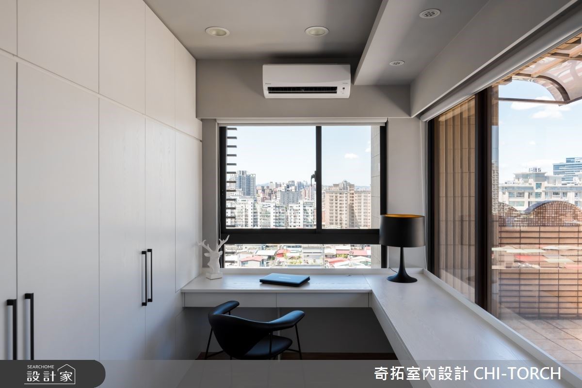 書房區域,以純白色系為底,營造明亮放大的視覺效果,而大篇幅的外窗將日光引入室內,一片窗明几淨,令室內產生一絲安定與寧靜。
