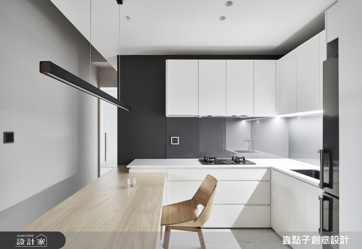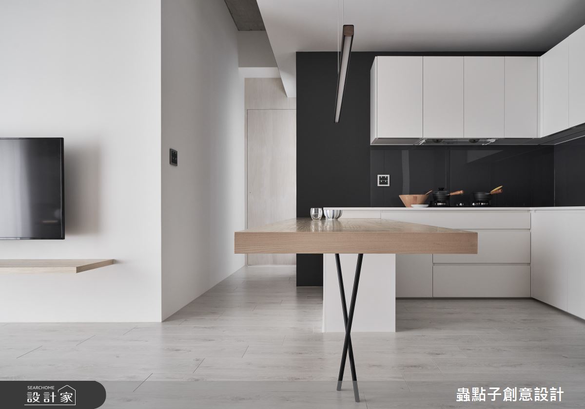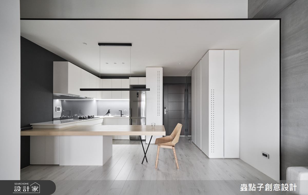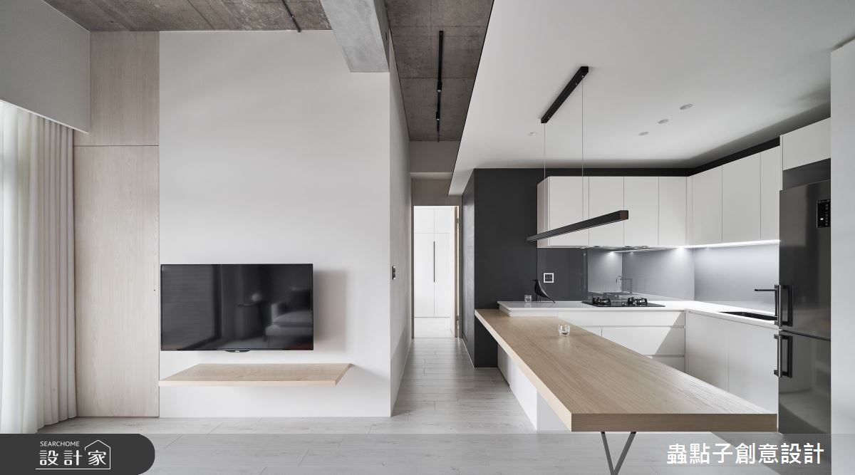 設計師透過簡單素材與簡約語彙,呈現無壓的舒適感受,並使用簡單、自然、溫暖的材質,營造乾淨俐落的氛圍,整體設計上,讓立面盡可能以簡潔方式呈現,且讓天花成裸露造型,始樑體成為裝飾的一部分搭,配明管與燈軌的架設,還原純粹的設計感;餐廚區安排延伸桌體,增加場域機能與便利性,除了可以作為餐桌外,也能延伸備餐台的空間,一側的黑白色系廚具,配置了設備與收納廚櫃,讓整體視覺更顯俐落乾淨!