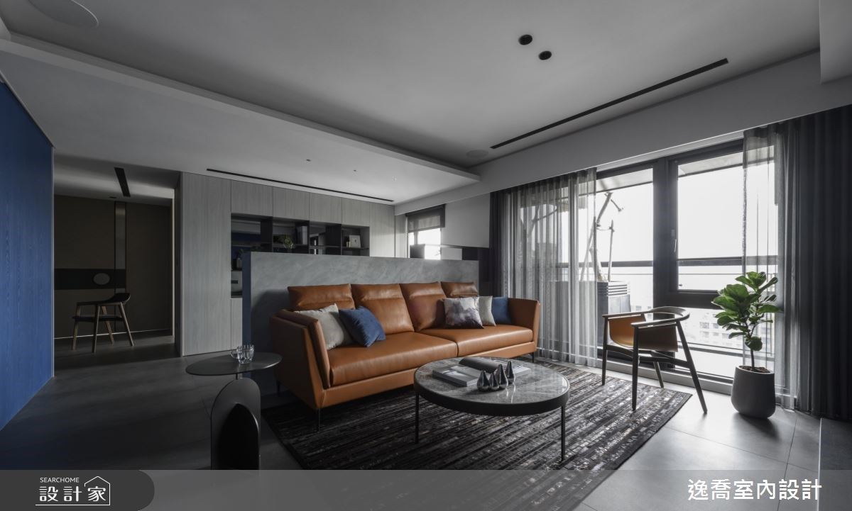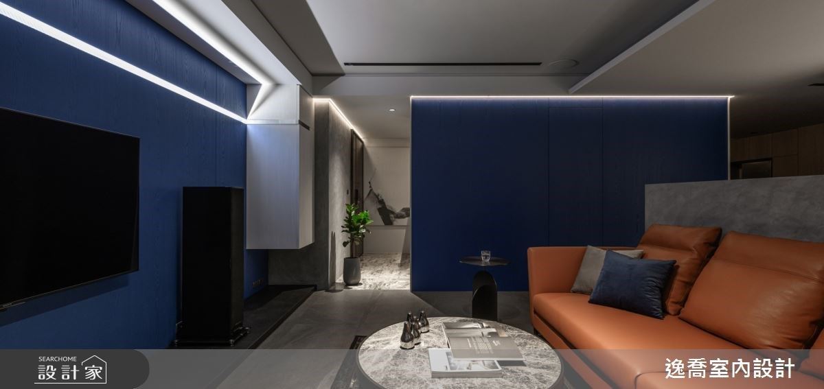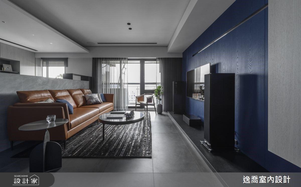 蔣孝琪設計師透過格局比例拿捏,將原屋3房化為寬闊主臥套房。從對屋主的認識與屋主挑選的照片中,蔣孝琪為空間大膽呈現獨特雅痞設計感。客廳壁面精選藍色木皮,以木質紋理營造沉穩、人文氛圍,讓屋主坐在沙發就被喜歡的藍色包圍。其餘空間面則和諧搭配仿水泥質感的灰與 Cappuccino 色,呈現空間的內斂底蘊。 不僅如此,蔣孝琪設計師還因應空間採光,透過異材質搭配,讓空間在淺灰漆面、帶灰木皮、深灰磁磚的層層堆疊中,細膩渲染整體居家的視覺層次。