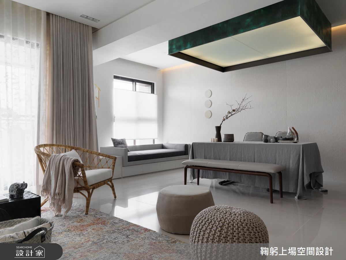 考量一家三口住在高樓層,設計師透過格局重整、動線重新規劃的方式,使各個空間的通風採光變得充足,欣賞窗外的四季遷移不再受到拘束。公領域採取開放式設計,客餐廳牆面皆鋪設淡淡紋理的西班牙花磚,無論是坐在客廳的籐編扶手椅上閒談,或是靠在餐廳的窗邊臥榻閱讀,心中的禪意皆油然而生。