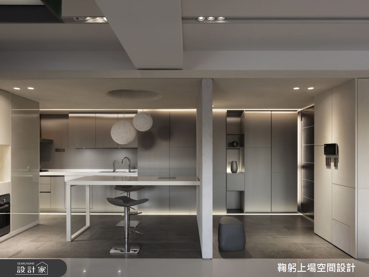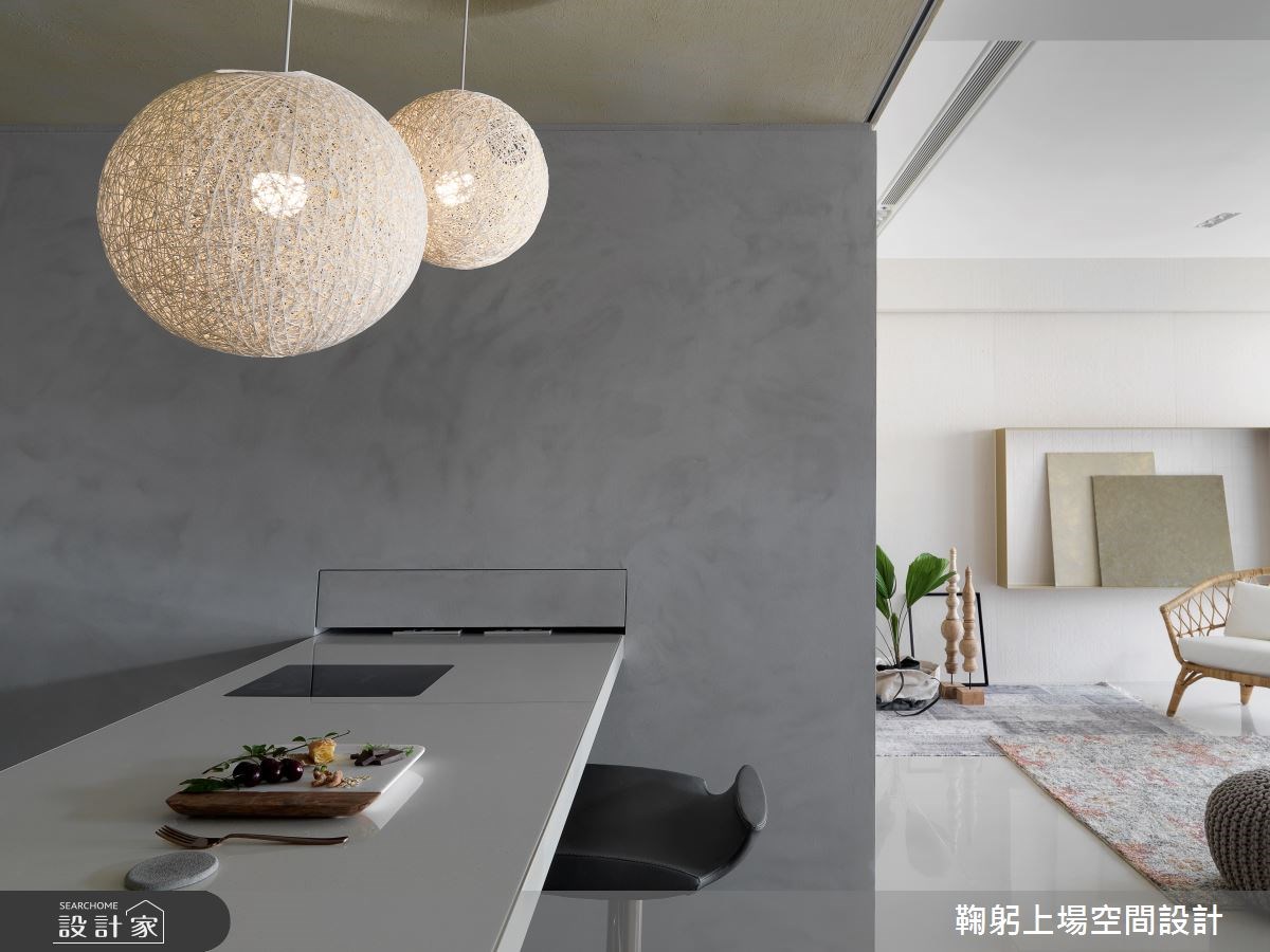 餐廳透過大型青銅燈飾,將帶有歷史人文色彩的家居亮點,挹注進純樸的灰階空間裡,與廚房中島吧檯的圓形吊燈,形成材質、形狀、份量上的強烈對比。而由於屋主熱愛烹飪,希望有開放式廚房能跟家人共享時光,又對油煙心有疑慮,因此設計師利用大片拉門保持空間開放度的彈性,讓歡笑可以照亮原本幽閉的廚房區域。
