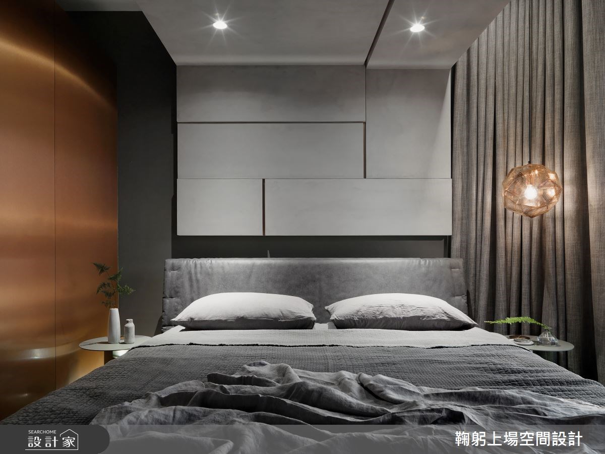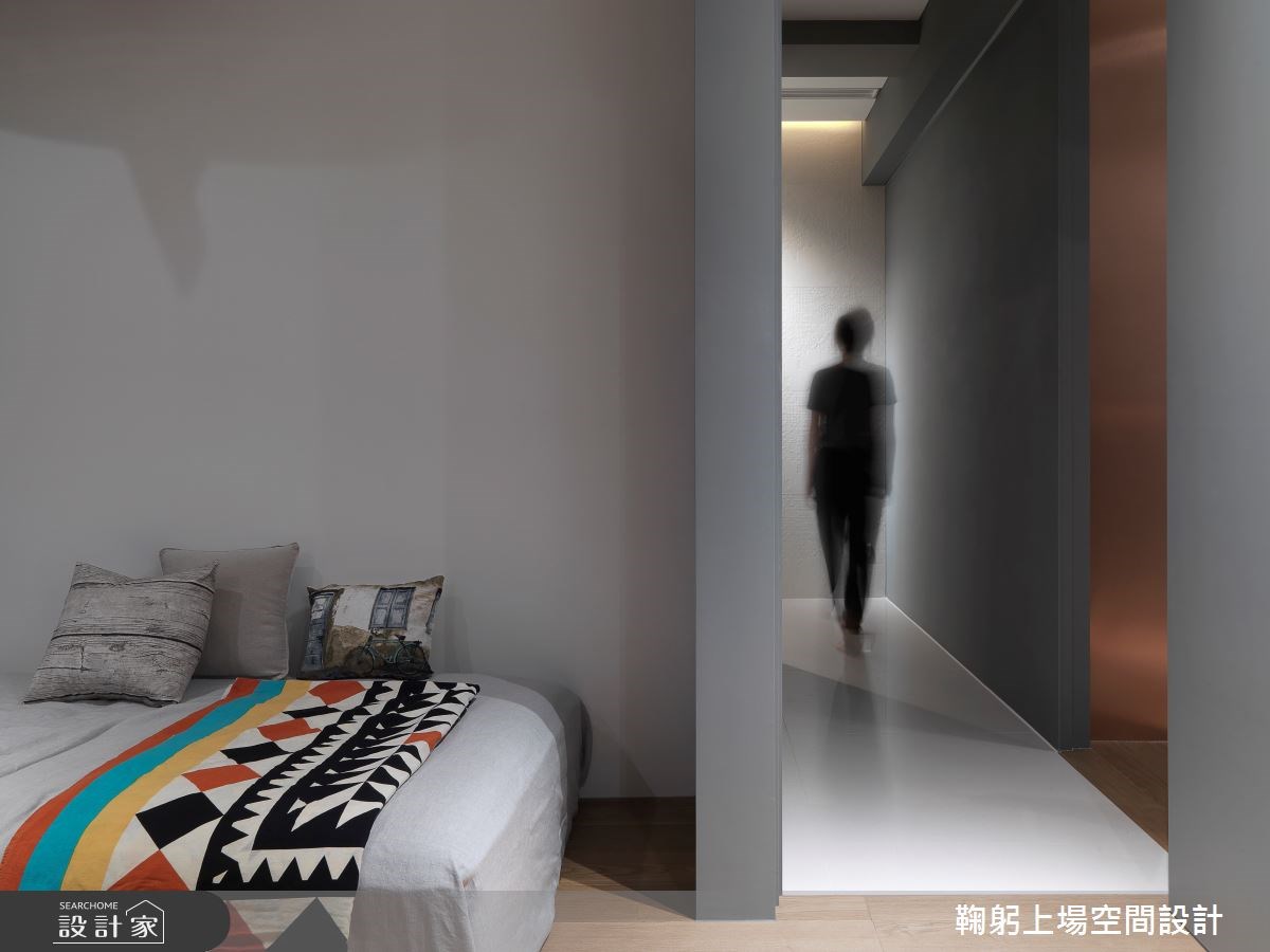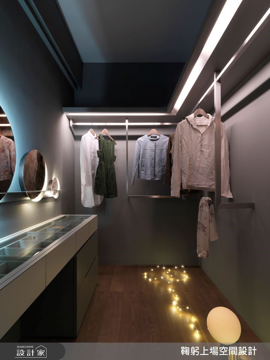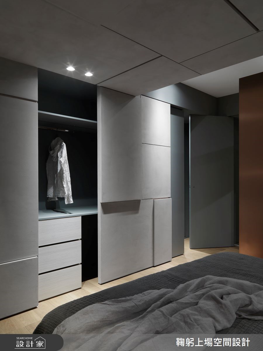 主臥以鍍鈦金屬分隔出更衣室,藉此避免房門對浴廁門的風水問題,同時更衣室隔間刻意保留上方縫隙,能夠共用睡眠區的光源與空調。另外,設計師把大量收納櫃隱藏於造型壁面中,一方面降低櫃體的壓迫感,另一方面又能給予屋主夫妻足夠的生活機能,使心緒自然和緩下來。