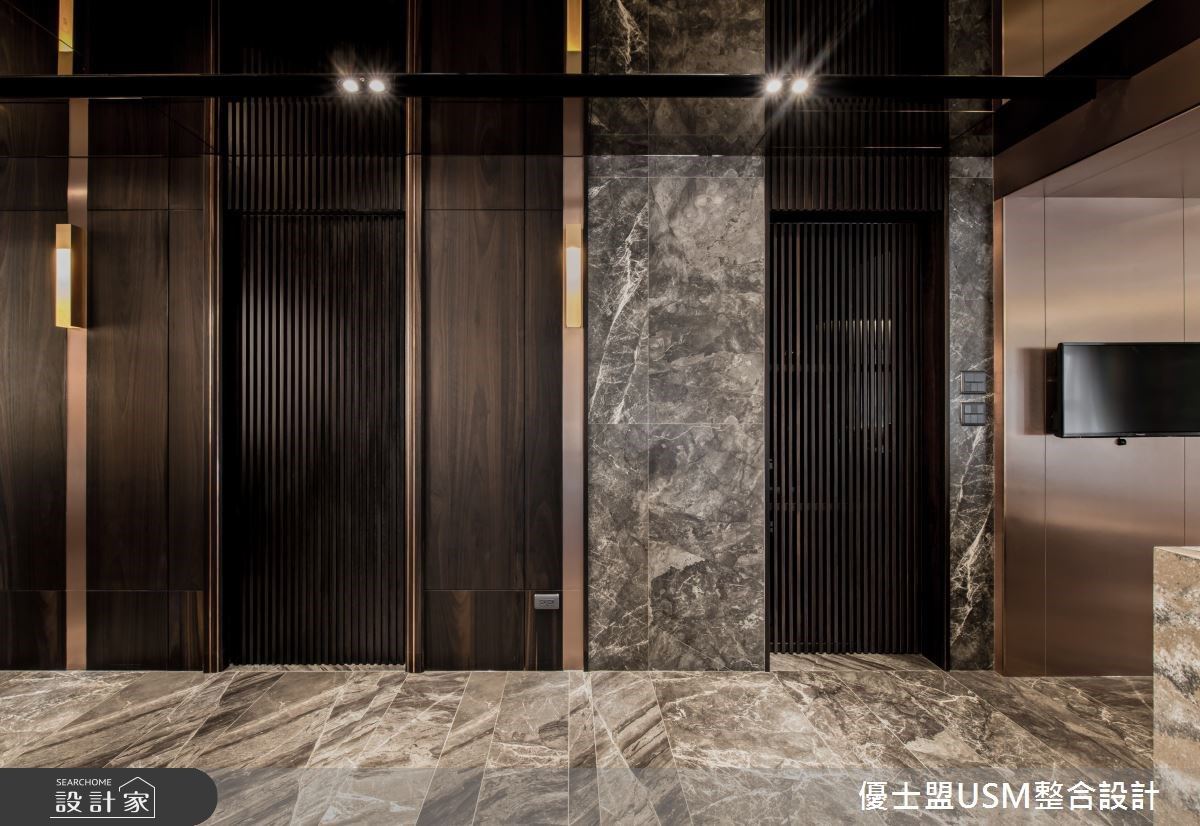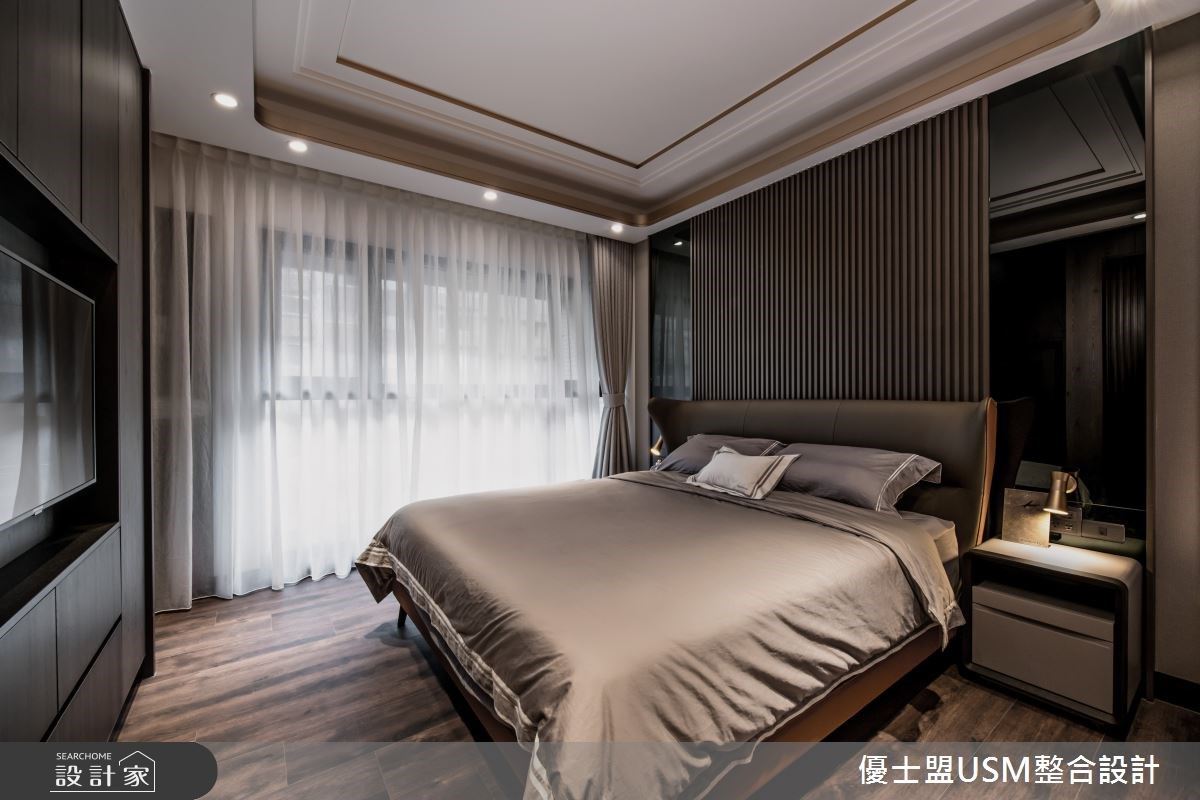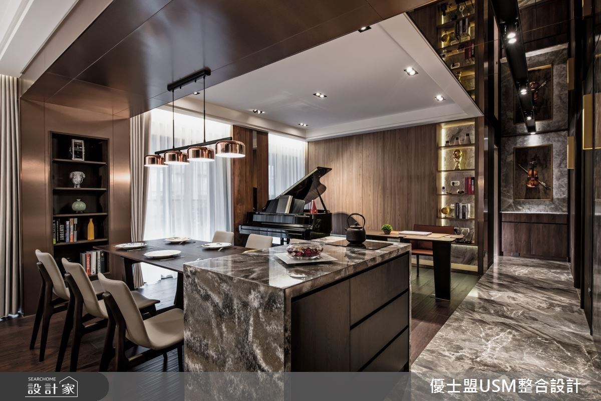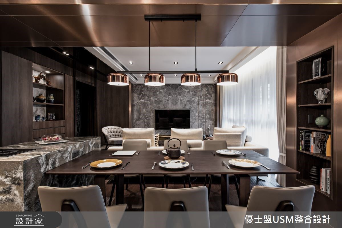 深色木紋、帶有灰黑紋理的石材為基礎下,替公領域打造出沉穩舒適感,局部利用金屬、銅條、茶鏡材質的點綴,提升視覺亮度,像是電視牆以大理石打造,表面嵌入些許銅條,大器之中挹注華麗感。玄關與走廊的地坪使用磁磚,一路延伸到廊道盡頭,創造和諧的視覺力道,與公領域的深色木紋做為鮮明劃分;餐廳上方巧遇大樑,透過鍍鈦材質的包覆,美化結構且與室內的精緻材質相互呼應,帶來放大視感;木紋餐桌與石材中島的安排,成為銜接客廳與書房的中繼站。