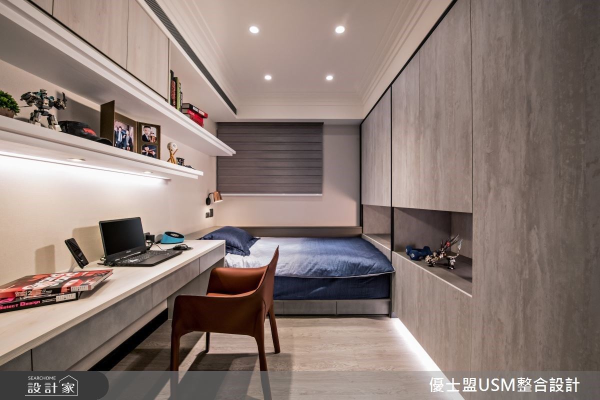 主臥以內斂色調安排,延伸公領域的沉靜質感;男孩房搭配整排木紋系統櫃,展現溫潤、明亮的休憩氛圍;女孩房以明亮色調呈現,衣櫃上量身打造音符造型的掛鉤,不僅能做為服飾收納,也呼應自身的音樂底蘊。