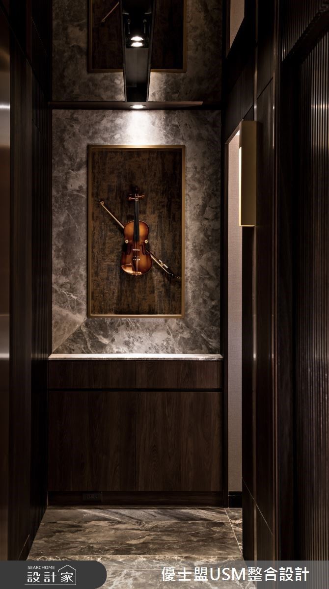由於屋主的兒子學習小提琴,在廊道盡頭特別訂製一面小提琴端景視覺。引入與電視牆同樣的石材襯底,鍍鈦勾勒出畫框造型,小提琴懸掛其中,詮釋兼具收納與藝術美學的獨特景緻。