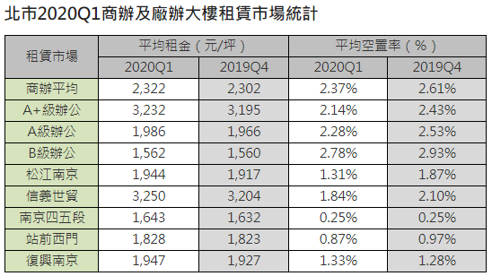 全球經濟受新冠肺炎的影響,正面臨最嚴厲的考驗,市場恐慌情緒蔓延,也使得各國紛紛下修經濟成長率,投資人心態轉向保守,讓回溫力道強勁的商用不動產增加了一些不確定性,而今年備受矚目的世貿三館地上權案,在壽險業炒熱氣氛下,為疫情注入強心針,對今年商用不動產市場極具激勵作用。依據信義全球資產最新統計,台北市辦公室平均售價仍為85.4萬元,未見修正,而在租賃市場表現良好的帶動下,空置率維持在3%以下,租金小幅上漲至2,322元,整體而言,台北市商辦尚未明顯受疫情影響,再加上都更熱潮,空置率低檔盤旋。