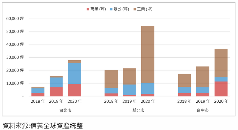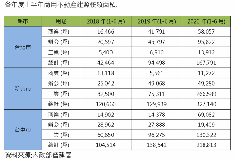 無畏疫情影響,商用不動產開發有感。信義全球資產公司觀察今年上半年核發建照面積發現,商用不動產開發面積有明顯的成長,六都又以雙北成長幅度較高,新北市為去年同期的2.5倍,其中工業類最為亮眼,上半年核發面積26.6萬坪,與去年同期成長3.5倍;而台北的商業與辦公面積同時成長,值得關注的是,台中商業類上半年核發面積已遠遠超越2019年全年度核發面積。