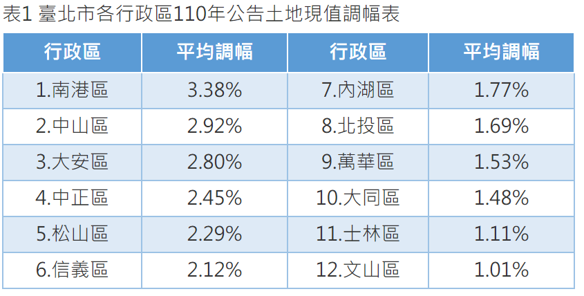 北市12行政區明年公告土地現值均上漲。漲幅最大的為南港區,主要受惠新東區門戶計畫與公共建設逐步推動,平均公告土地現值調幅3.38%居首,漲幅最少的為文山區。