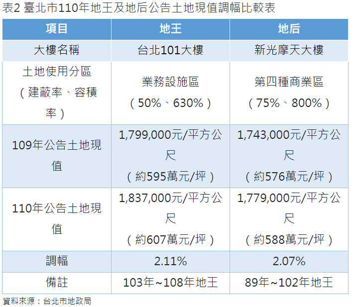 反應北市地價上揚,台北市110年公告土地現值平均調漲2.17%,調幅為5年以來最高的一次,地王則是由101大樓8連霸,以每坪約607萬元居冠,北市雖然有高達92.3%的地區上漲,但受疫情衝擊嚴重的觀光商圈與部分大型飯店地價則是逆勢下跌。