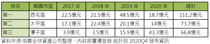 位列交易第二熱區的太平區,進駐廠商多為中小型企業,區內主要有太平產業園區及大里工業園區,其中太平產業園區從2018年陸續完工,有助區域內傳統產業轉型以及未登記工廠合法化,帶動工業地產交易規模穩定,未來政府還規劃捷運大平霧線,將經過大里工業區及太平產業區,將更有助此區產業發展。而排名第三的潭子區為精密機械重鎮,此區域可說是蛋白區大翻身,2020年交易金額約43.3億元更是比2019年的15.9億元成長171%。