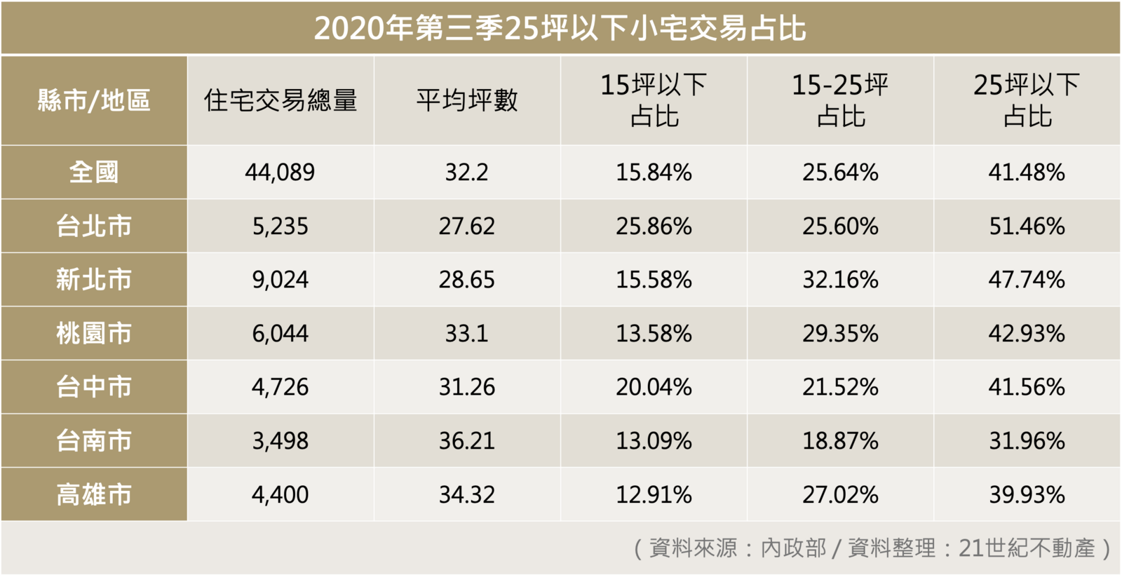 根據內政部最新公佈資料顯示,2020年第三季全台住宅共交易44,089件,25坪以下的小宅占整體銷售超過4成,25坪以下的小宅自2017年第二季起已經連續10季銷售佔比超過4成,21世紀不動產企劃研究室指出,可見小宅已然成為目前國人買房新趨勢,21世紀不動產企劃研究室襄理董家菱表示,現代人嚮往極簡生活,科技與裝潢技術日新月益,愈來愈多傢具或家電標榜輕薄化或是一物多用的多功能,就算入住小宅也能享受大空間,可以說小宅是「進可攻、退可守」的不敗產品。