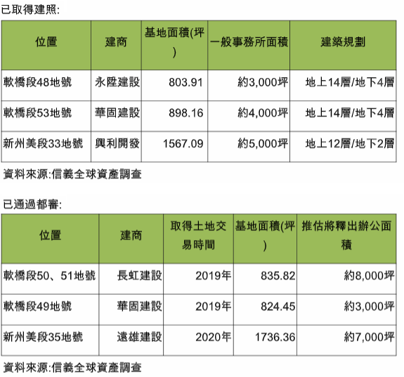 建商看準企業發展對辦公空間需求,在台北科技走廊持續超前佈署,信義全球資產公司觀察北投士林科技園區科專區土地開發狀況,包含永陞建設、華固建設、興利開發已取得建照預計蓋廠辦大樓,預計會釋出1.2萬多坪辦公面積;若再加上已經申請都審、登記信託擬合建或興建的土地、以及市府預計招商地上權案,預估未來6年內將會釋出15萬坪辦公面積。