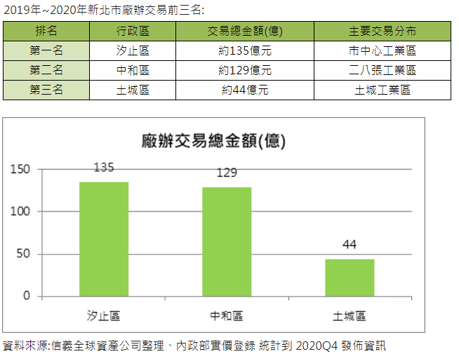 台灣成為全球產業鏈技術資金佈局重區,科技傳產等產業加速發展,讓新廠辦屢傳整棟交易捷報,持續提振整體商用不動產市場,而新北市廠辦交易前三大熱區又是哪三區?根據信義全球資產公司統計實價登錄已揭露資訊,2019年至2020年新北市廠辦交易總金額排名中,汐止區以135億元排名第一,占整體新北廠辦交易金額30%,中和區以129億元排名第二,土城區以44億元排名第三。