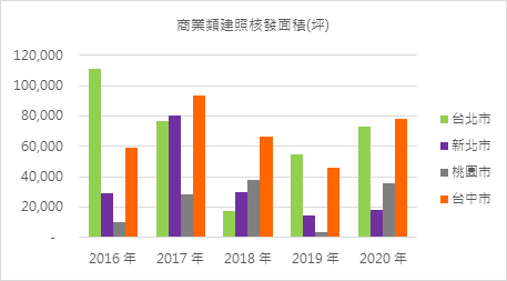 台中近年城市發展快速,有著人口成長、各產業的隱形冠軍群聚、交通建設推動、舒適氣候等條件,成為國內外大型企業、台商回流重要跨區插旗之地。除了工業類建照核發面積2020年達26萬坪,較前年成長近50%,與2017年中美貿戰開打時的面積相比,成長一倍之多。另外值得關注的是,台中近五年商業類建照核發面積達34萬坪,已超越台北市,為六都之冠,代表除了精密製造業外,有許多休閒服務類產業也看好台中,擬在此持續布局。