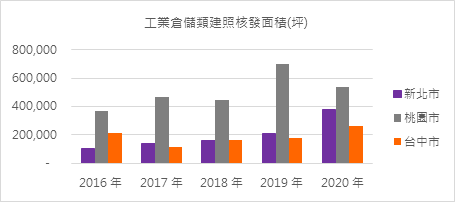 信義全球資產公司總經理柯宏安分析,科技業擴大布局,廠房需求增加,考量購地成本與供應鏈,許多企業選擇由北往南做跨區域或多地同時設點,加速建置產線。桃園產業鏈完整且有進出口交通優勢,始終是企業首選之地,2020年工業類建照核發面積達53萬坪,近五年核發總面積超過250萬坪,佔六都該類建照核發面積量40%。另外,亮點區域是新北市,2020年達37萬坪,除與2019年相比成長83%,為六都同期成長幅度最高縣市外,更是2016年的3.8倍;產業升級需求在工業區立體化方案與捷運路網刺激帶動下,產業在新北投資設置廠房廠辦趨勢越來越明顯。
