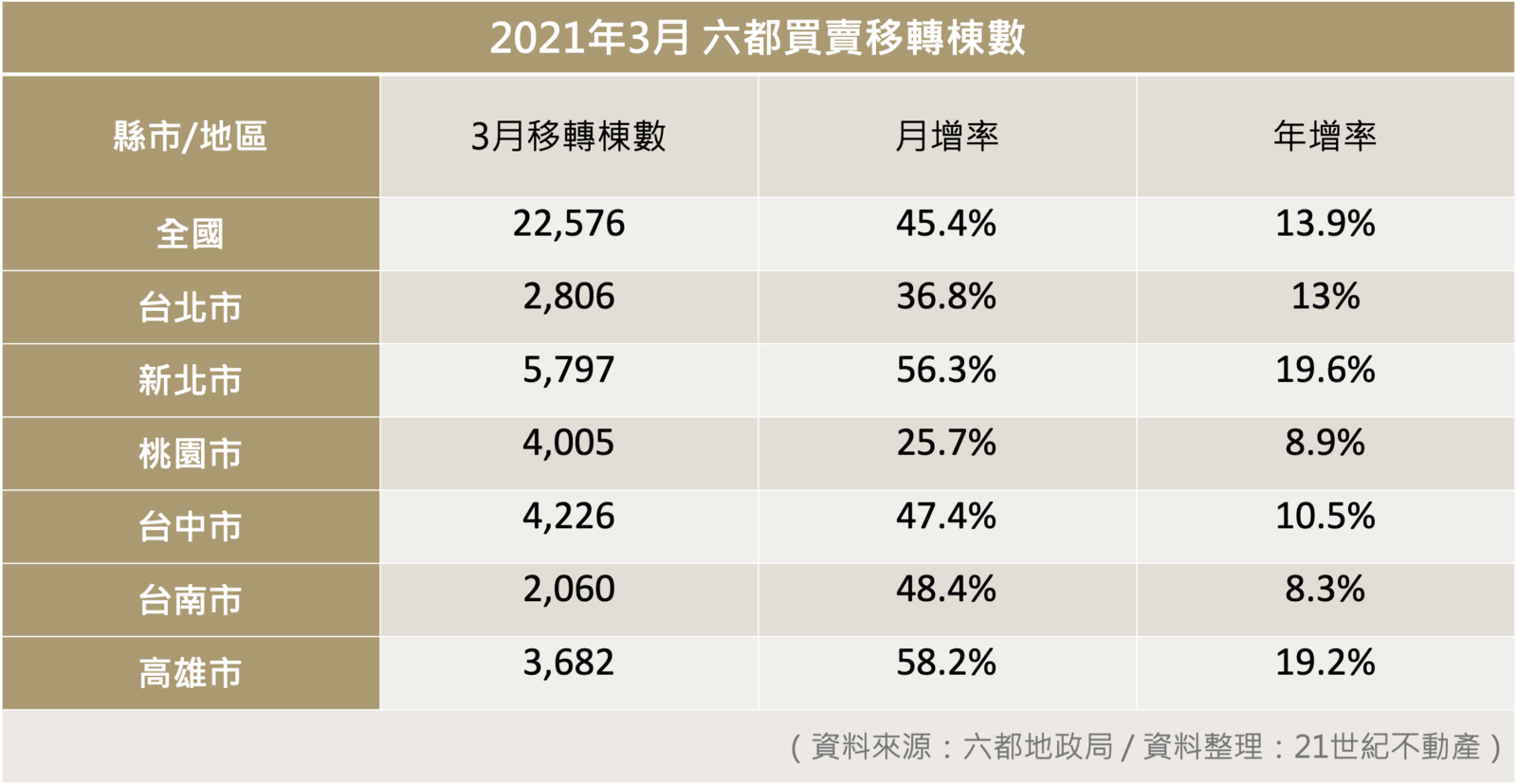 結合以上反映在2021年3月六都的買賣移轉棟數,合計交易量達22,576棟,創下十年以來新高,月增45.4%、年增13.9%,21世紀不動產企劃研究室表示,有資金需求的賣方將會趕在7月1日即將上路的房地合一稅2.0前交易,而有買房需求的民眾也可趁此機會積極交涉,預期在Q2交易熱潮會持續。