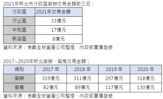 去年國外疫情衝擊,讓許多台商在考量供應鏈避險與防疫下回流急擴廠,加上新北市政府從107年開始祭出工業區立體化方案,帶動新北市工業地產交易,信義全球資產公司觀察今年新北市廠辦實價登錄統計,以汐止區交易總金額33億元最高,中和區與新店區分別以17億元、8億元排名其後,捷運沿線開始有廠辦化效應,也帶動了產業鏈群聚變化。