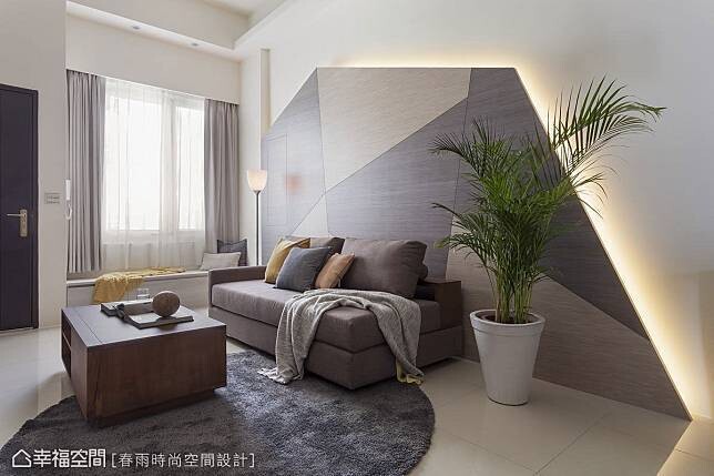 因為屋主喜歡簡約的造型,所以以屋主挑選的家具顏色做發想,採用了一深一淺的木皮為主調,打造沙發造型背牆,並將弱電箱隱藏在裡面,並用不規則拼貼手法,搭配燈光設計,在挑高的公共空間裡營造空間的趣味感。同時利用客廳落地觀景窗,配置一張臥榻,底下桶身的收納就負擔了部分鞋櫃的功能,擺放屋主常穿的鞋外,另二格臥榻下收納空間則可以收納客廳的使用物品。而相同的木質設計語彙也在客廁門片、廚房冰箱隔板,還有收納櫃的部分相呼應。