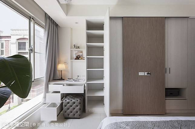 最欣賞春雨時尚空間設計擅長在有限預算下,將收納及使用機能整合,並用精簡的裝飾,使未來能依需求簡單進行改造。例如在主臥床尾一側不僅規劃整面櫥櫃,更配置一道滑動式電視牆,不影響收納量之餘,也預留線路通過空間。書房則以多功能房的形式彈性規劃,並藉由畫作及系統板材打造書櫃,利用各異的材質拼接,營造格狀的表情變化,也化解房屋格局限制!