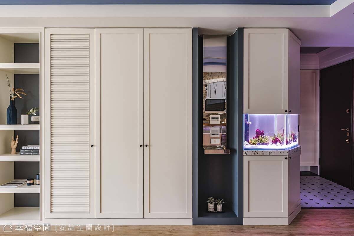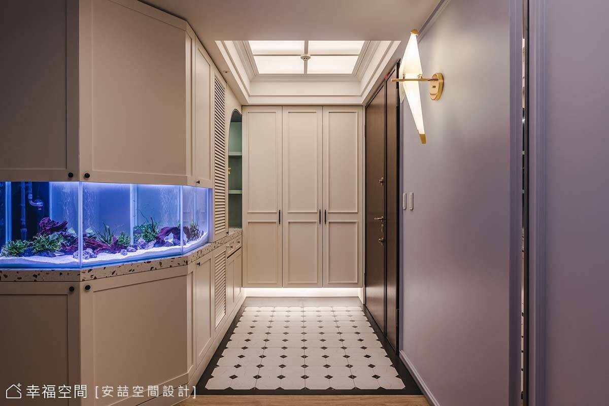 融入屋主多種喜好的居家,處處充滿驚喜。玄關就結合了男主人喜歡的光帶,女主人偏愛的花磚、弧線等美式輪廓,並巧妙鑲嵌繽紛的水磨石,點出隨興自由的空間調性。順著廊道斜切面,設計師訂製了造型魚缸,滿足屋主嗜好,也讓一家人能夠坐在吧台或沙發區,輕鬆欣賞魚兒在水中優游自得的姿態。