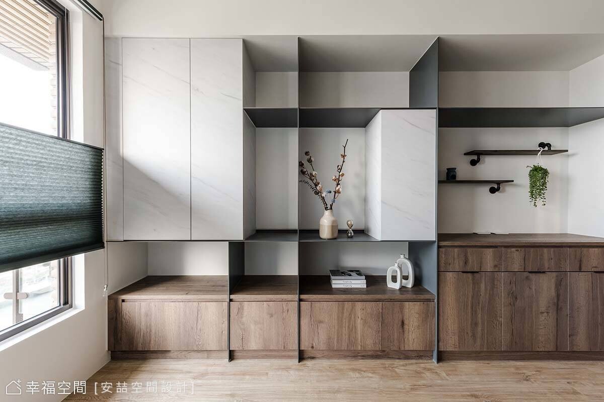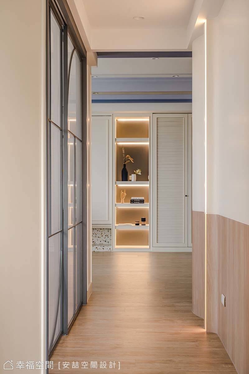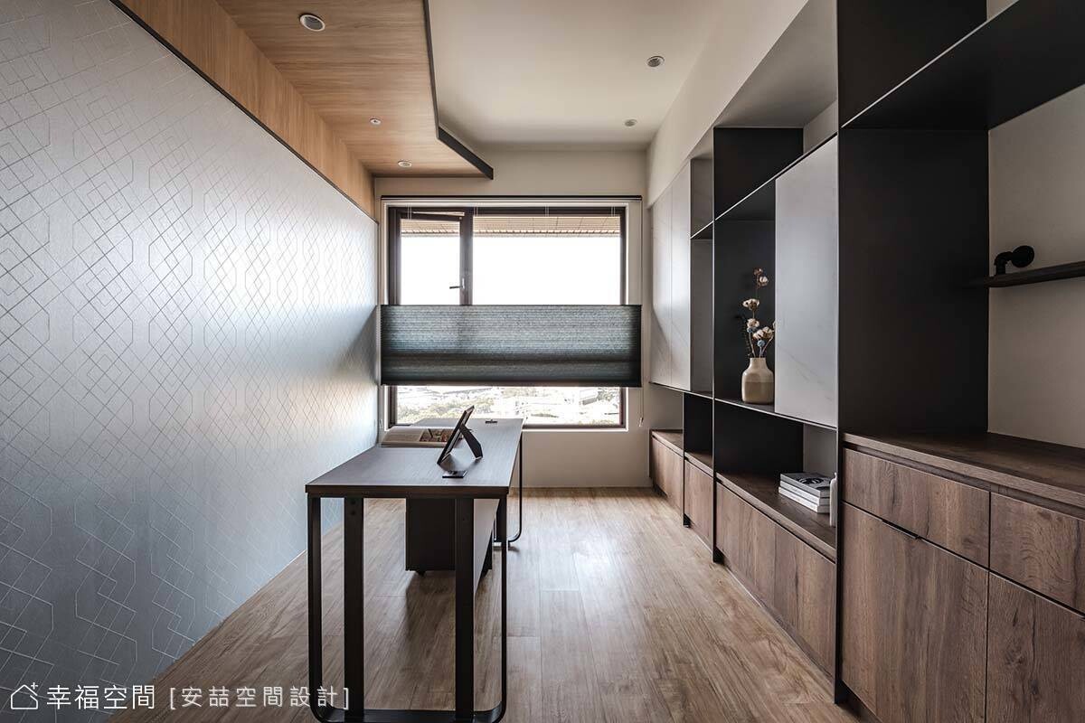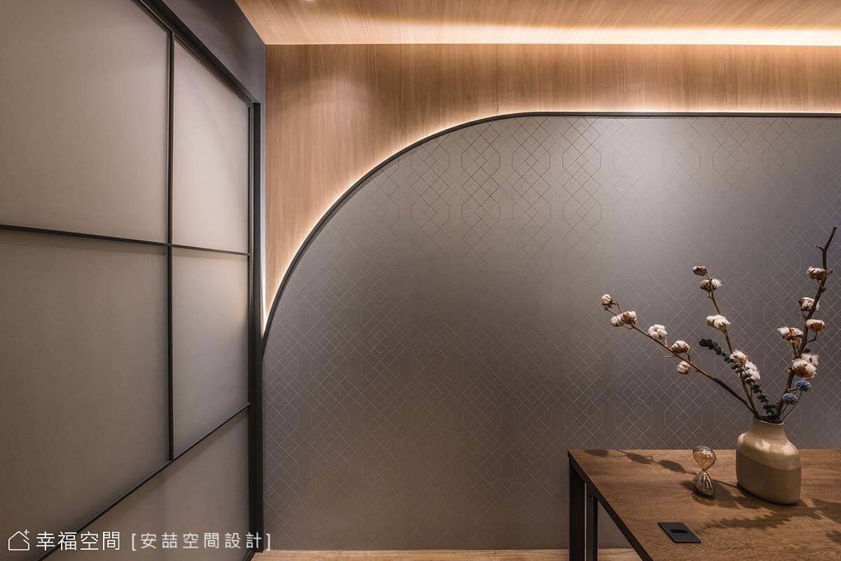 客廳電視牆規劃了大量收納,並利用可推移的橫拉門,作為櫃體門片及電視檔板,發揮雙重用途。廊道區植入光帶與圓弧牆面豐富視覺,兼作書房的小端景。書房以木質、幾何浮雕壁紙與鐵件營造東風禪風,天花板運用曲折線段延展視野,同時消弭梁柱帶來的壓迫感。
