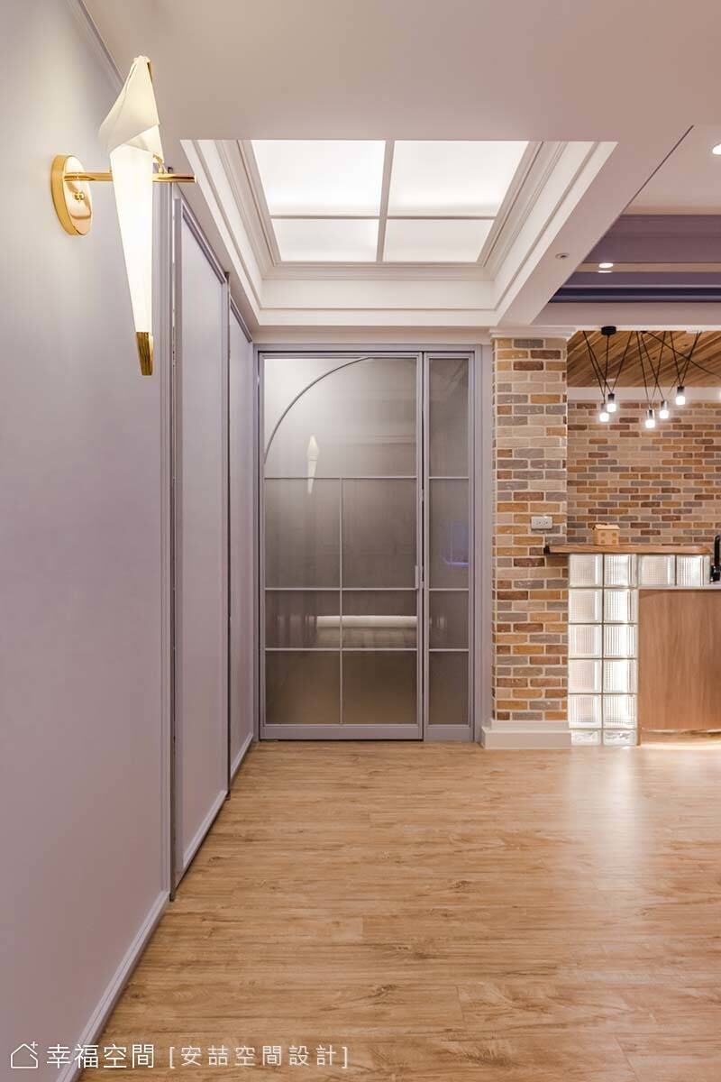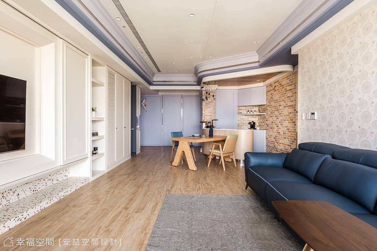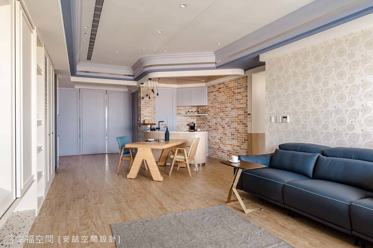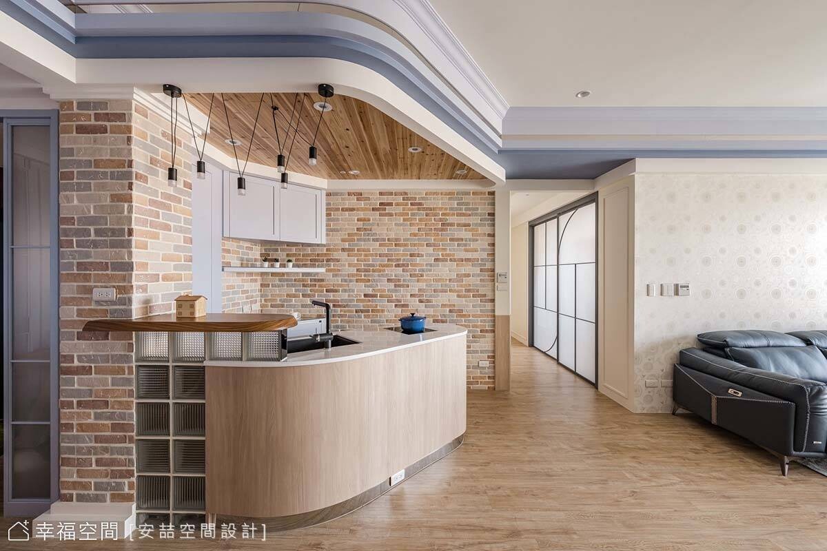 步入客廳前,可見廚房玻璃拉門揉入半圓弧線條,呼應空間主題。前方的紫藕色牆面也以同色系門片隱藏著偌大的儲藏室,補足收納機能。轉身入內,可見搭接著玻璃磚、木質的斜面中島吧檯,與深淺不一的紅色文化石,構築出鄉村風濃郁的休憩區,使居者宛如置身異國咖啡館,盡情享受閒適慵懶氛圍。至於緊倚著吧檯的餐區,設計師賦予了高機動性,可視情況挪移,騰出開闊場地供孩子活動。