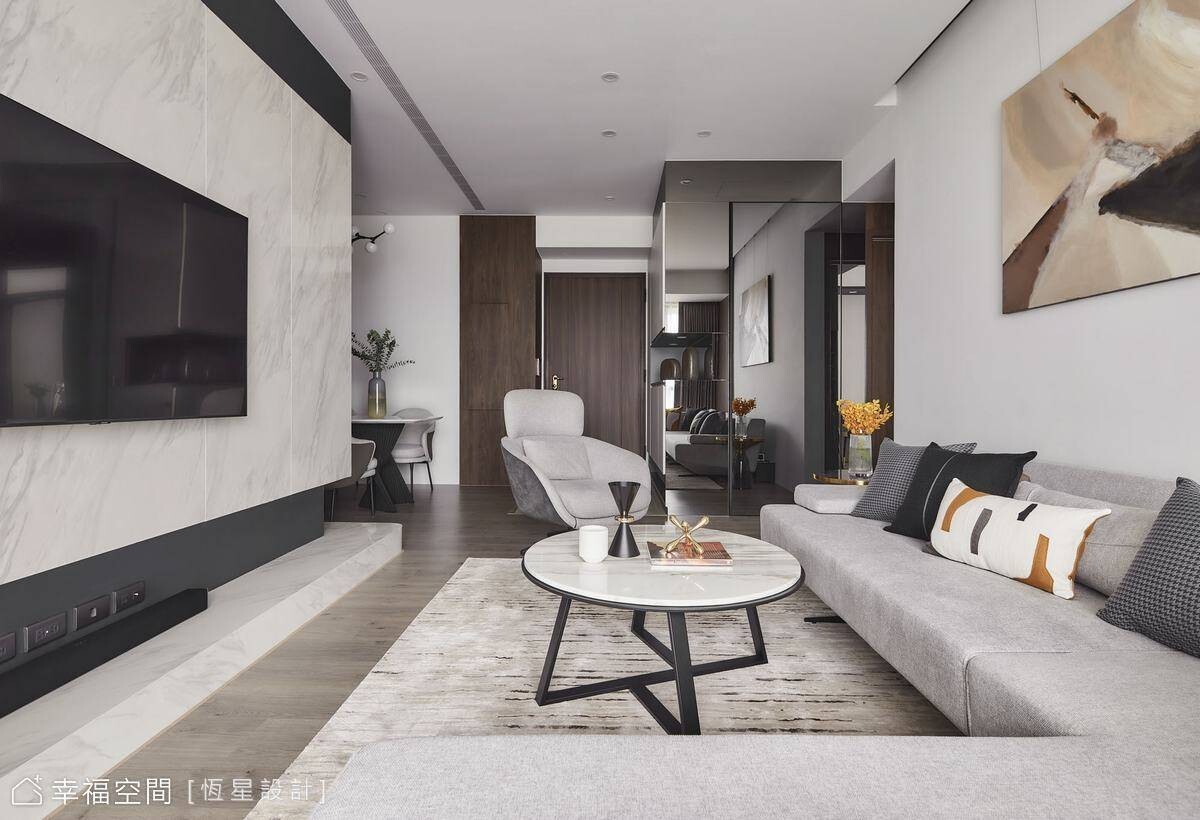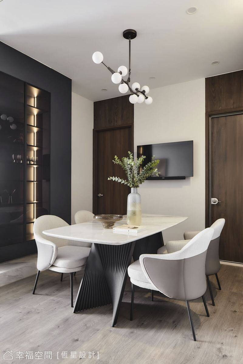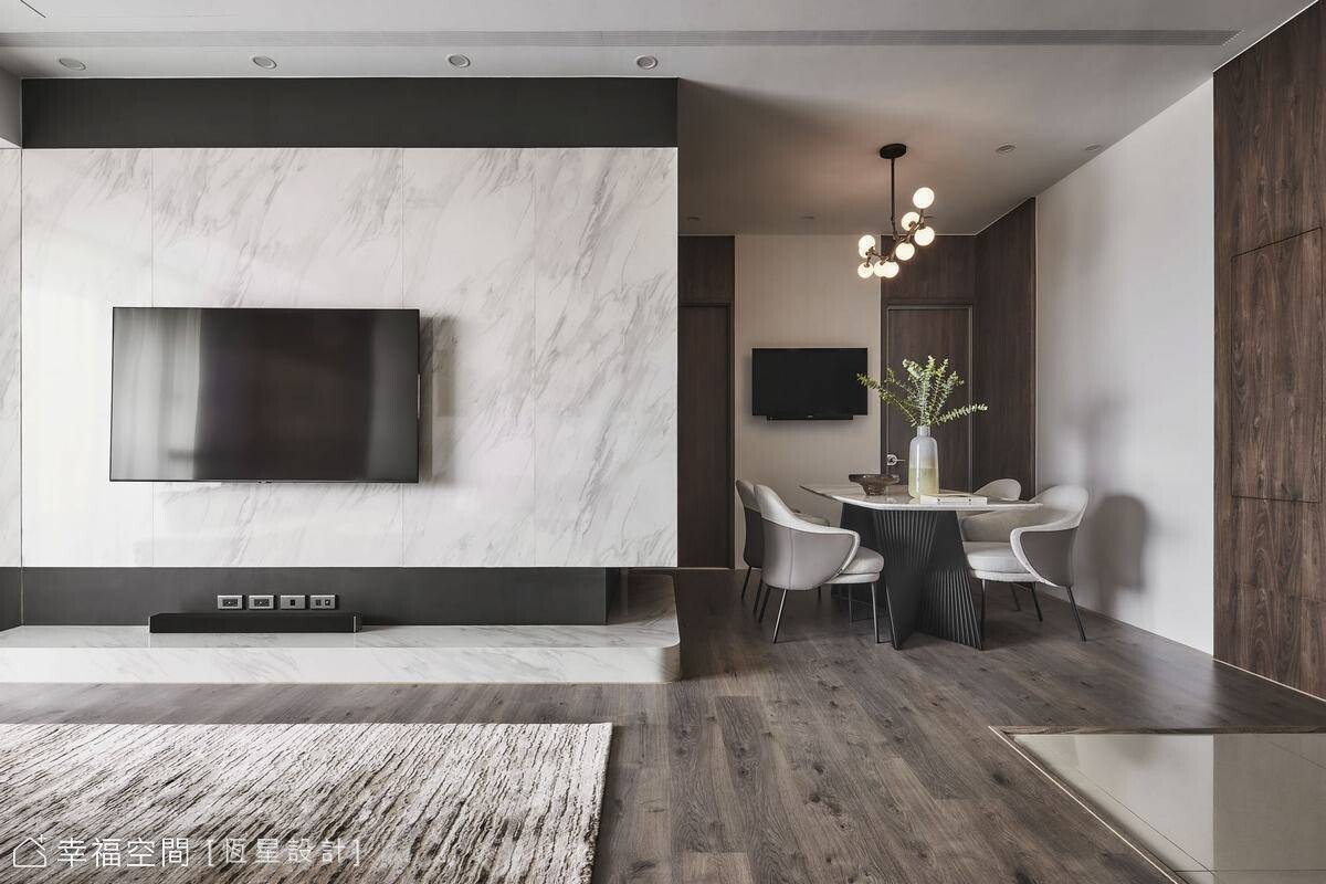 客廳運用L型低落地檯面延伸結合客餐廳兩個空間,電視牆融合既有牆面+隱藏門+木作牆+展示櫃,一氣呵成電視牆的大器整體感。