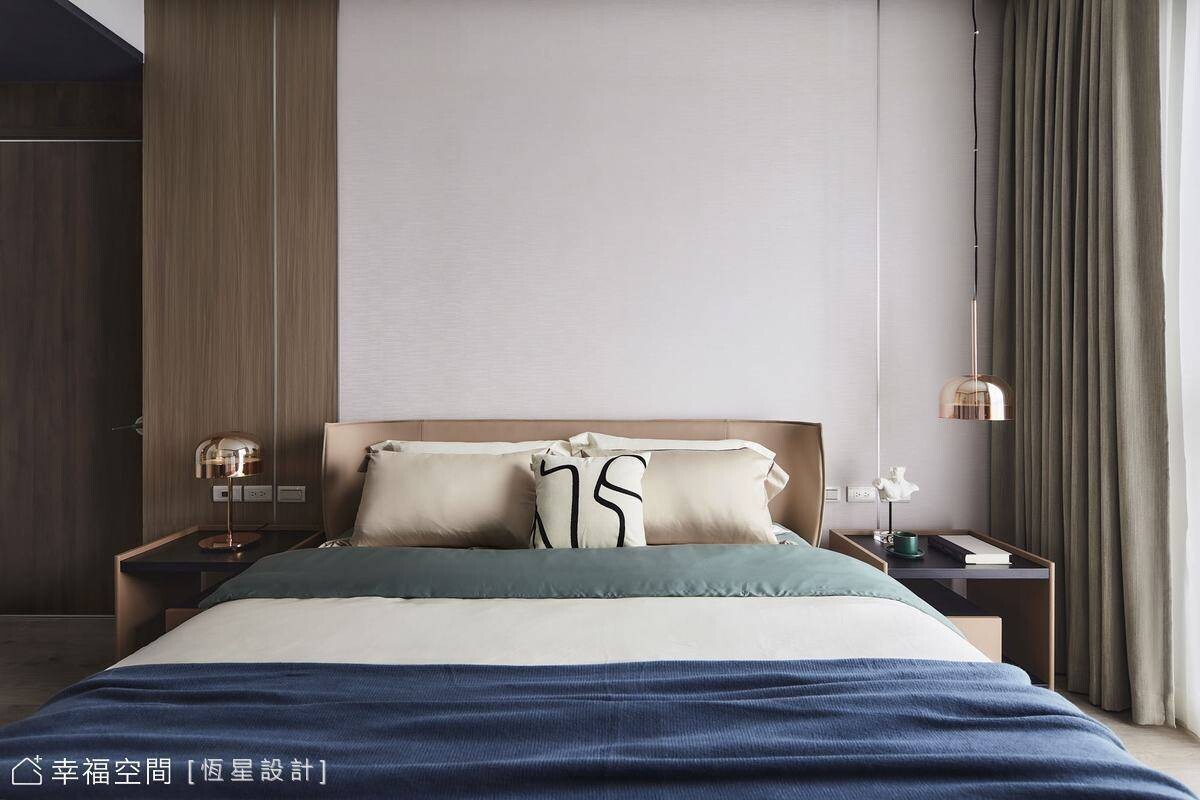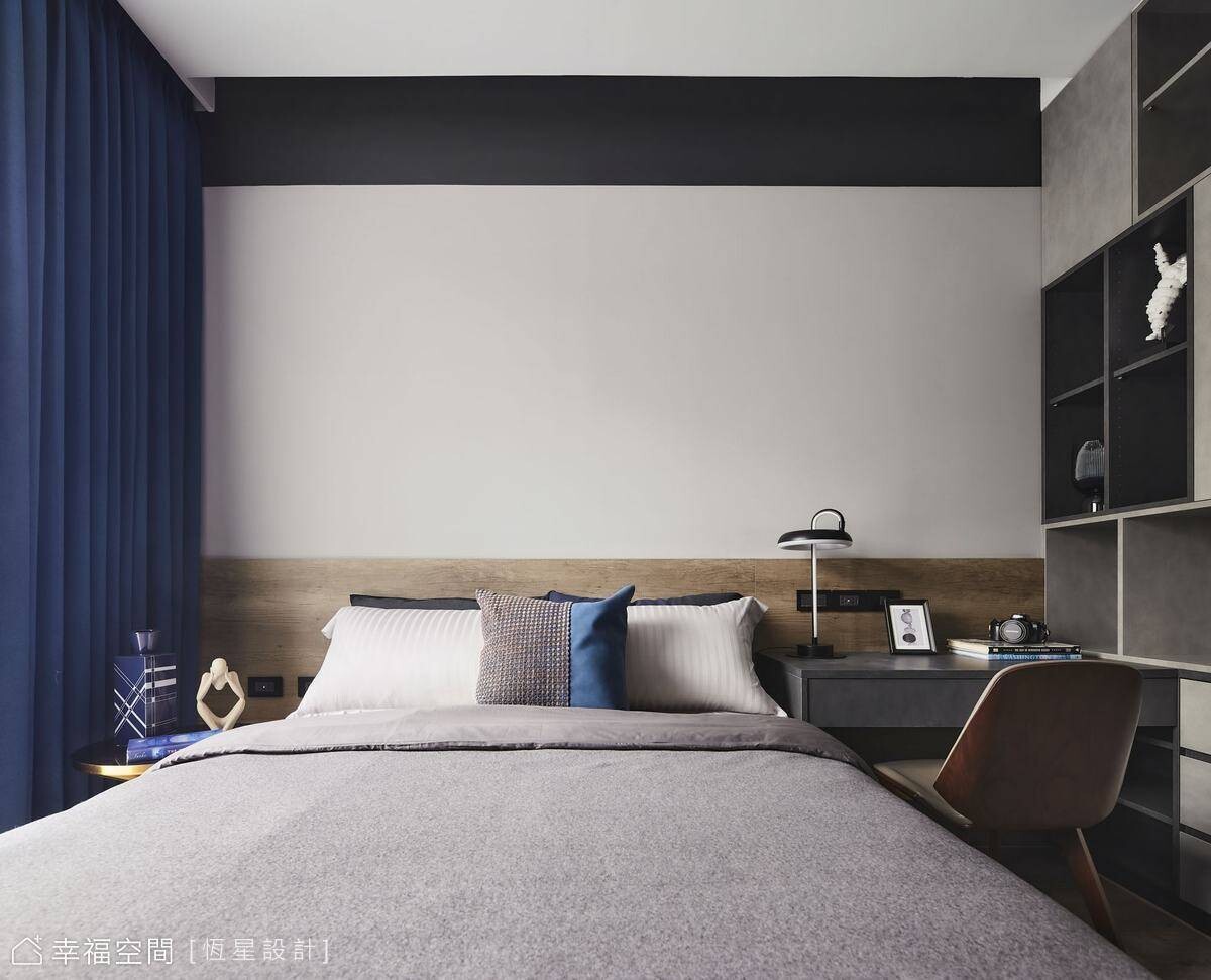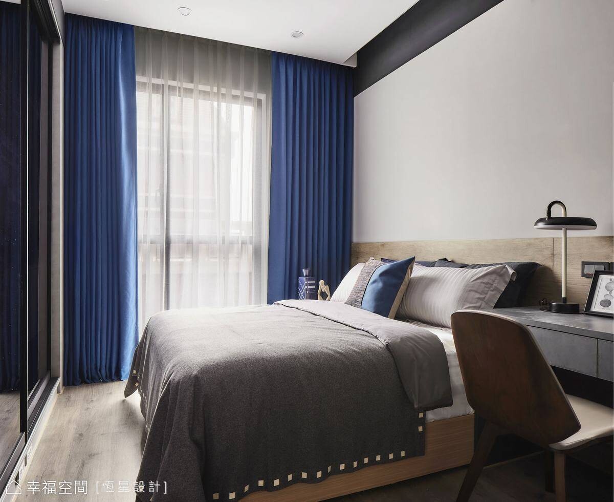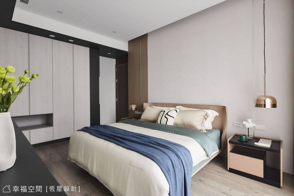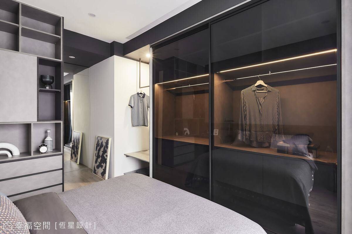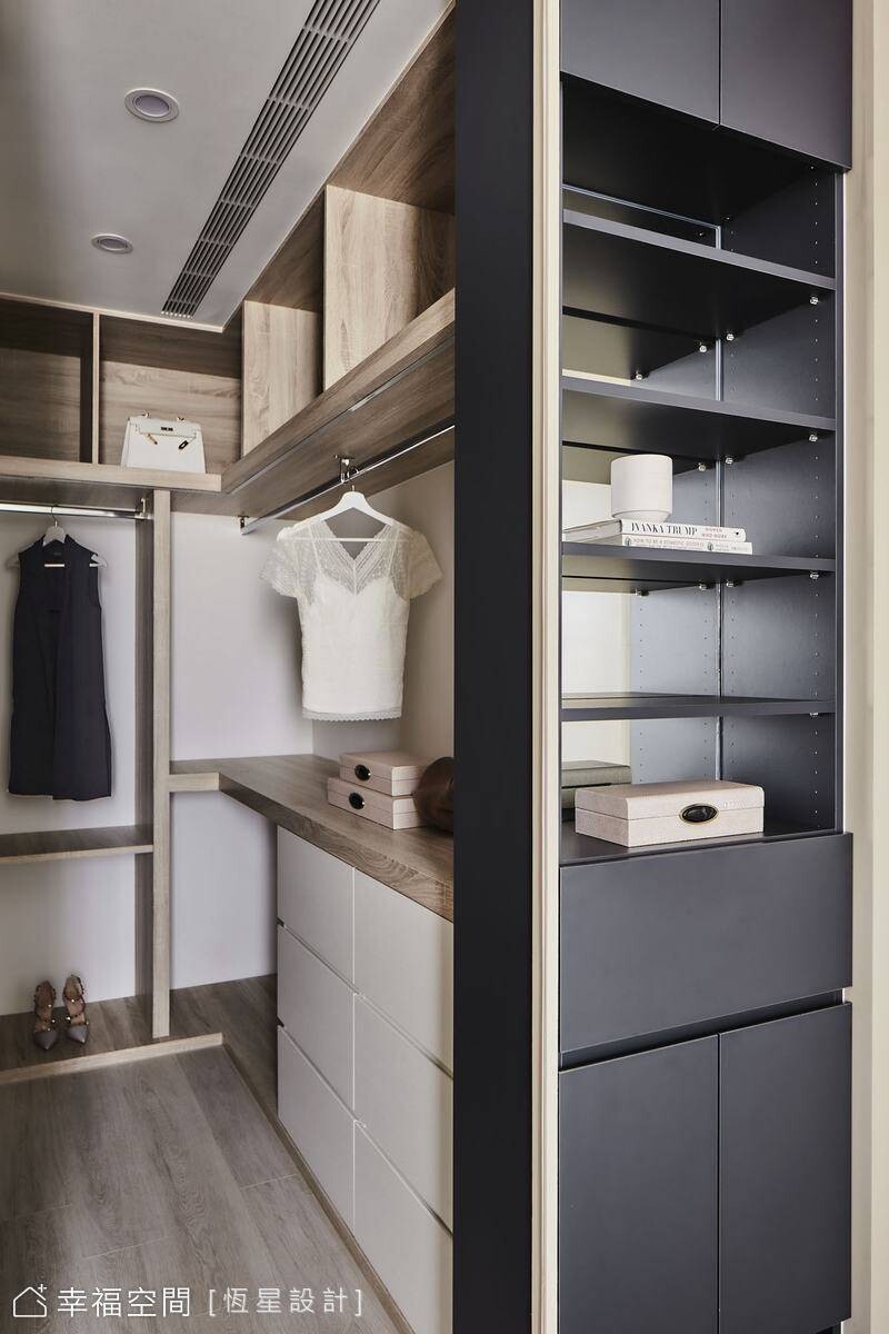 主臥著重收納需求,同時將展示櫃、衣櫃、書桌及收納櫃一氣呵成地連接呈現;大學生女兒房特別規劃專屬於自己的獨立更衣室;高中生兒子房具備大量書籍收納空間,並使用開放懸掛鐵件兼顧汙衣區需求 。