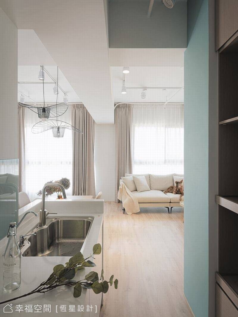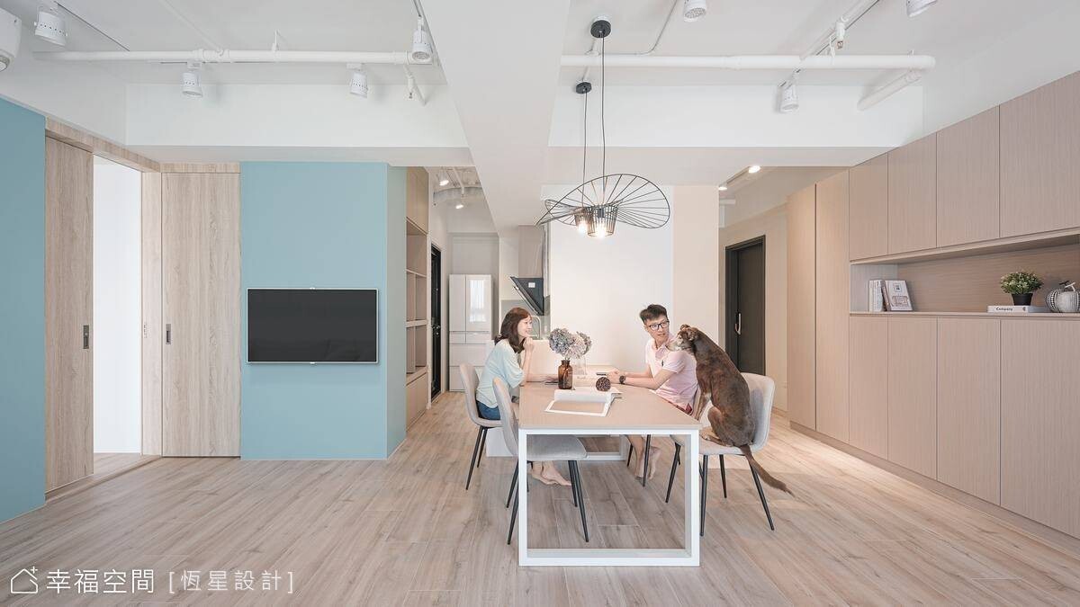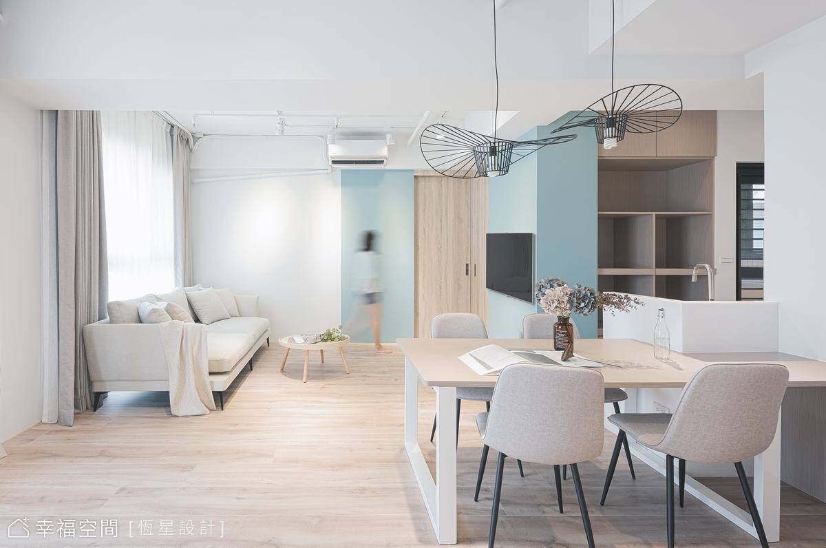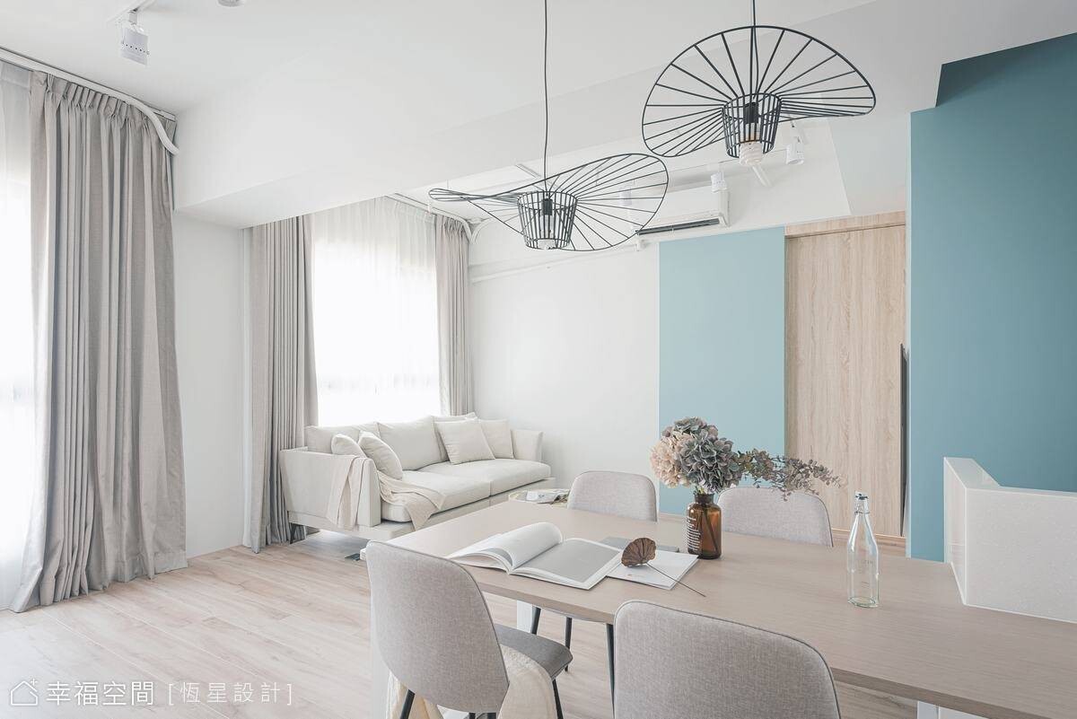 透過設計,鄧湘盈設計師將生活品味的執著體現在居家生活中,讓生活美學變成一個自然而然的事!藍綠色的清新知性,交織米色的典雅平和與親切感,融合出空間饒富生氣與溫度。在恆星設計師悉心搭配下,以牆面分割跳色,讓立面呈現出活潑跳躍的特色美感。