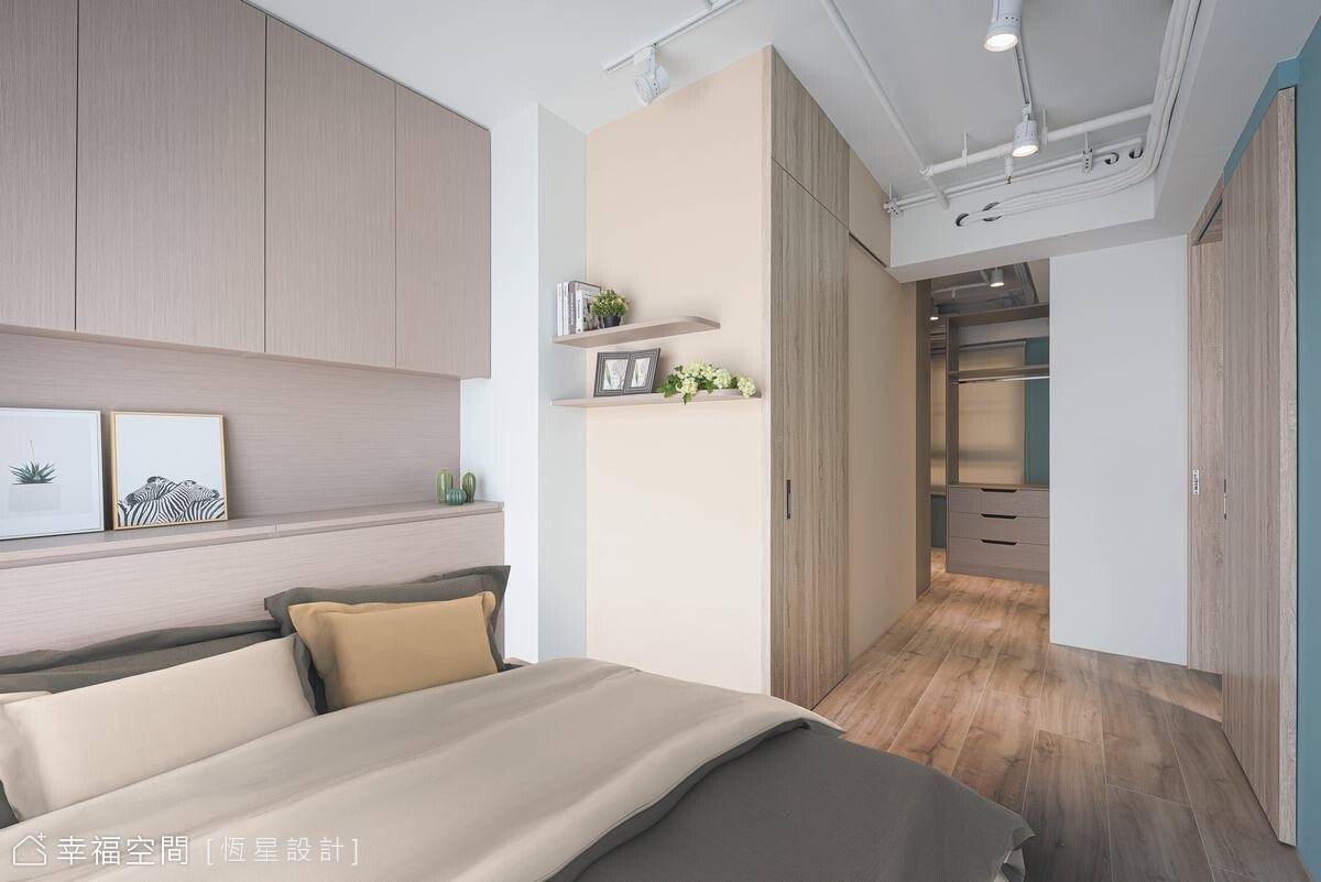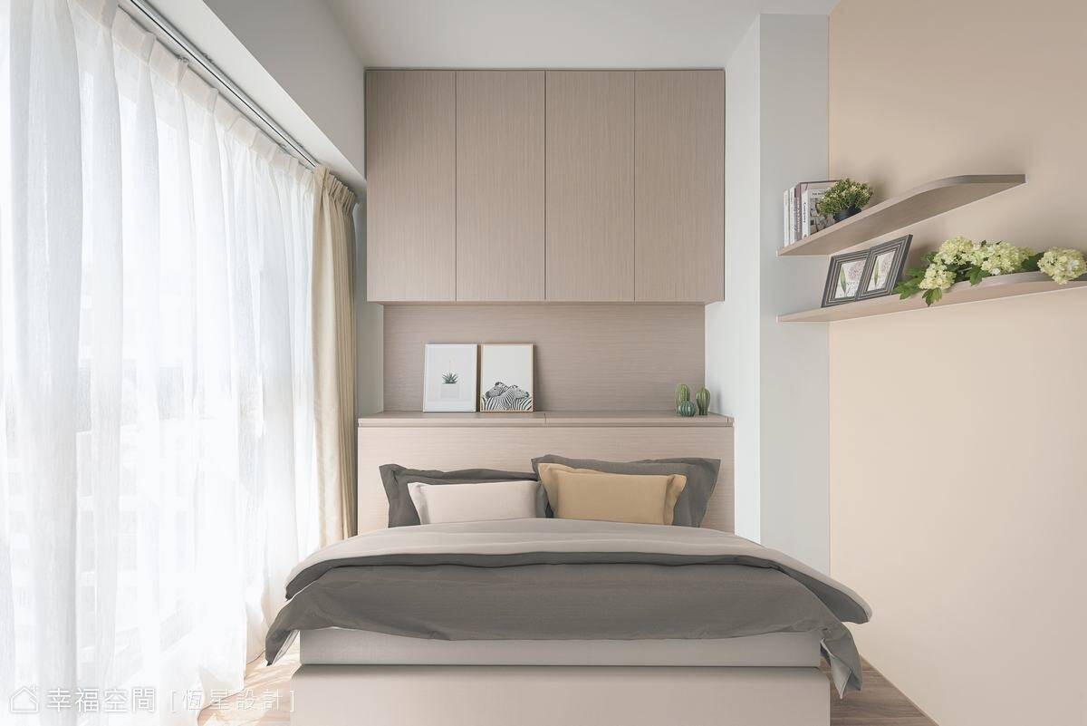 進入私領域,木質調主臥床頭設計,運用上下櫃體增加收納,櫃體中空規劃,不會讓人感覺到壓迫,而是能感受到木頭的溫潤舒適感。