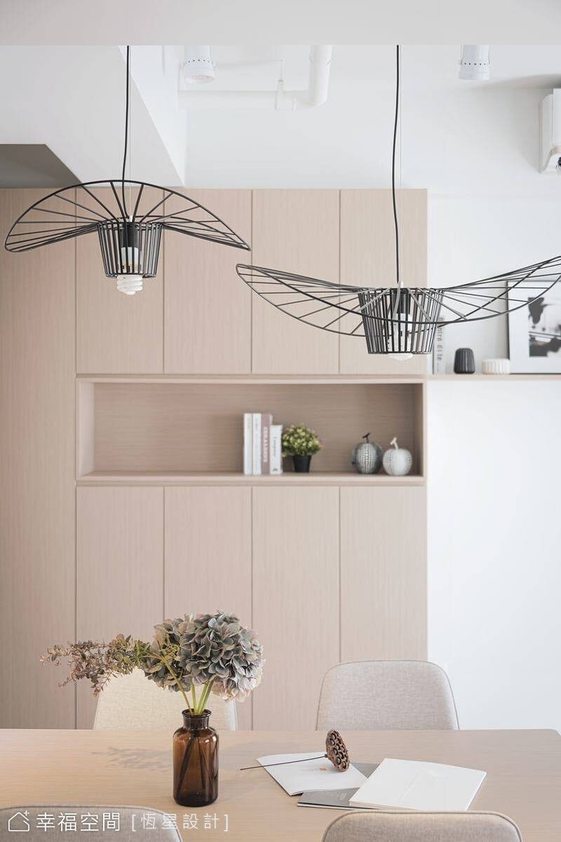 擅於拿捏空間尺度,運用空間的高度,刻意不做天花板,採以工業風格設計,使縱線的空間無限延伸,在開放式格局的安排下,賦予空間開闊感,且開放式廚房與餐廳融為一體,增添餐廳更豐富的機能性。訂製的餐桌既是一家人用餐的場域,也能化作工作桌使用,佐以現代簡約且造型別緻的黑鐵吊燈,成為一進門就能十分吸睛的視覺焦點。