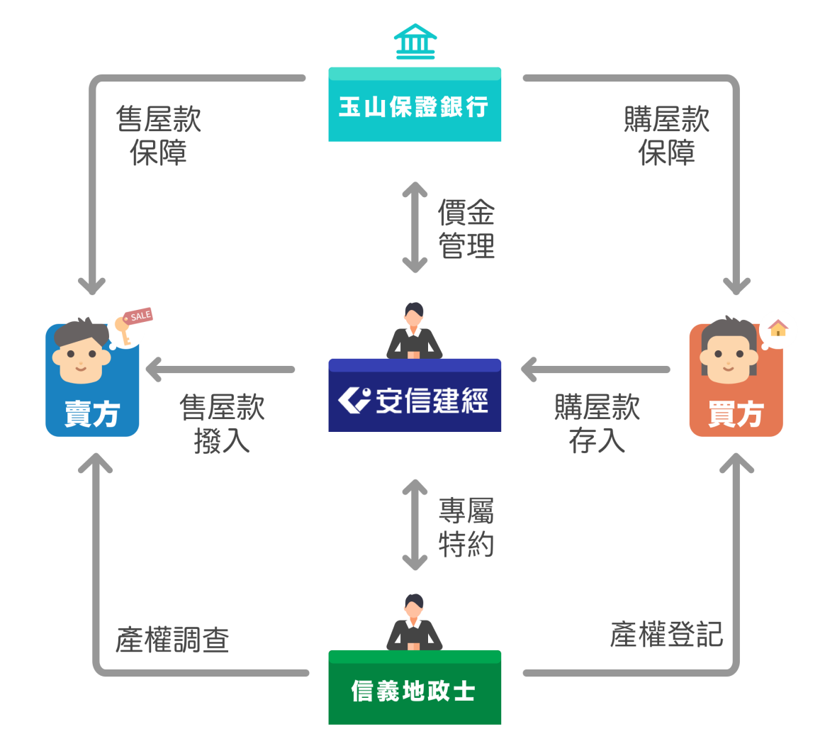 為保障成屋交易買賣的款項安全,由台新銀行及信義房屋共同投資的「安信建經」,擁有超過25年以上的金流管理經驗,自民國85年起與信義房屋合作,參考美國施行已久的ESCROW制度,因應國內市場交易實況,率先研發出符合台灣的「買賣價金履約保證」制度,為台灣房仲交易安全制度的一大創舉。