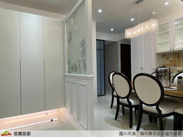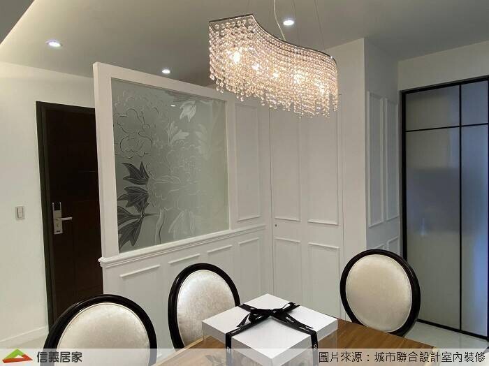 廚房場域以北二高的拉門與餐廳做為一個轉場劃分,緊鄰玄關的餐廳則同樣運用隔板解決開門見灶的問題,設計師更不忘在隔板上鑲嵌玻璃雕花片營造視覺饗宴,櫥櫃中央所鋪設的磁磚再再凸顯出全室風格的一致性。