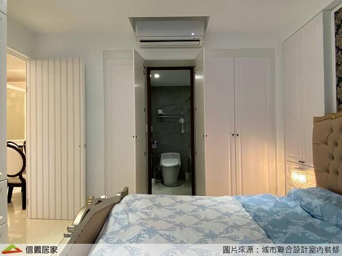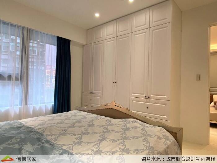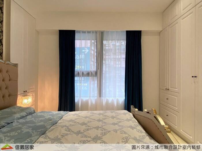精巧融合古典及美式風格的線板元素又再次運用在主臥裡,連續性的古典線板,以清新素雅的白色為基底,將床頭邊兩盞精美的水晶燈與華麗宮廷風的床頭板恰到好處的串連在一起,一點也不顯突兀,反而營造出賞心悅目的浪漫公主房。