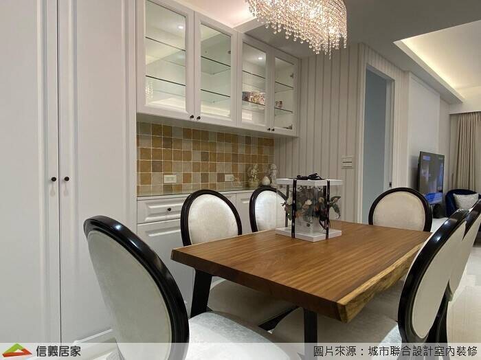 古典風的要素之一絕對非線板莫屬,電視櫃與電視牆面的潔白線板搭配大地色的家具,與沙發背牆上的收納櫃相互映輝,為空間注入清新優雅的古典風格;而整面的沙發背牆收納櫃體,一貫採用線板勾勒出典雅品味,以灰藍色為櫃體主調,為空間氛圍增添一點溫潤的色彩。