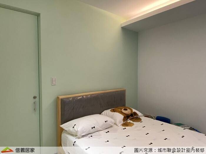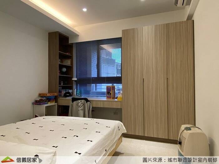 採用「森林」的翠綠為發想,淡淡的青綠色伴著木質感的衣櫃、書桌、收納架,讓房間充滿著悠閒的渡假氛圍,希望孩子在繁重的課業下,有著一片自己的天空休息充電,重整腳步再出發!
