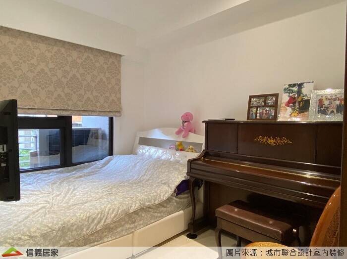 長輩房無須過多的裝飾,將原有的鋼琴做為擺設,在牆上鑲入量身訂製衣櫃加強收納,顯現出居者簡潔有力的灑脫感。