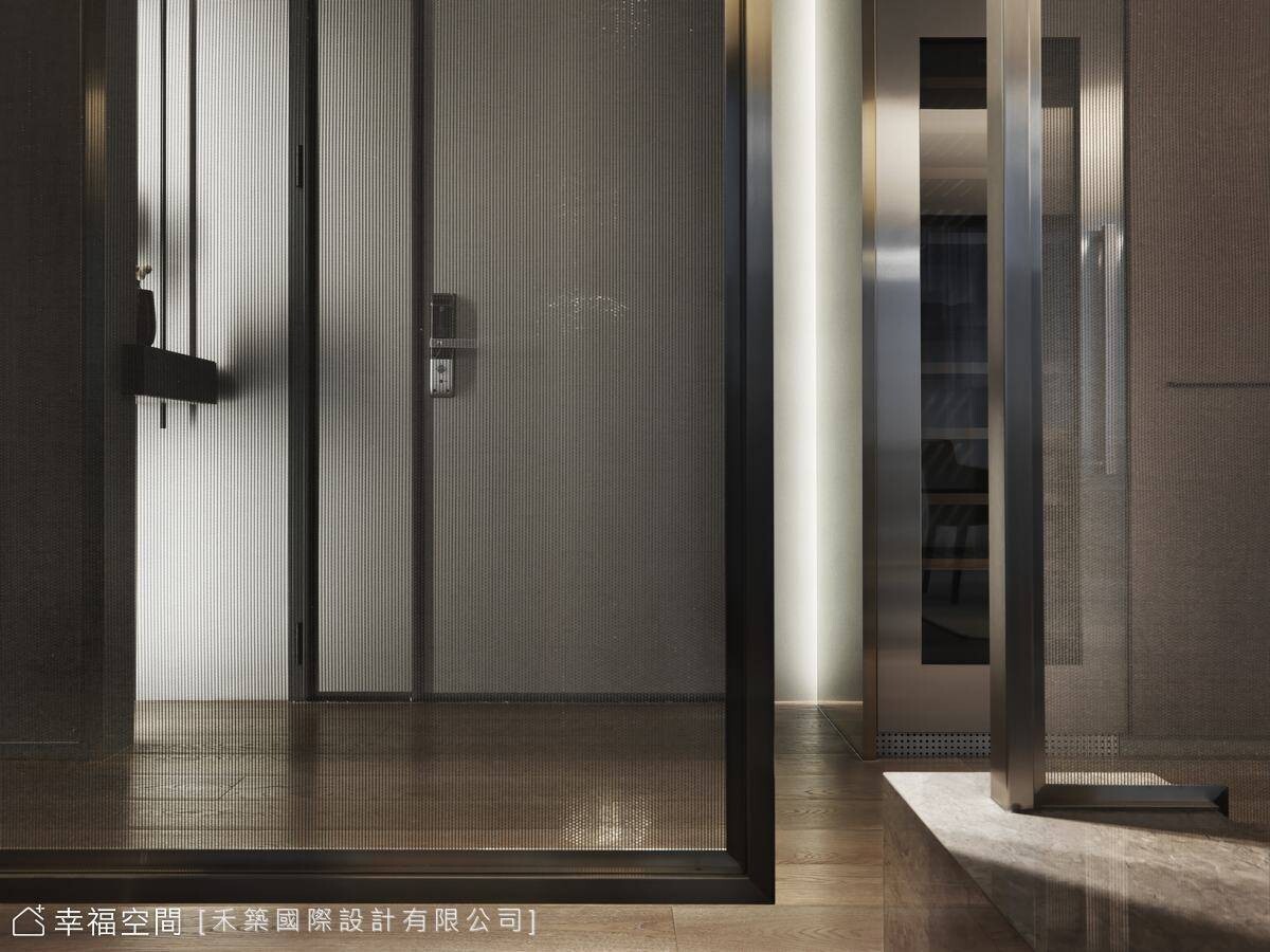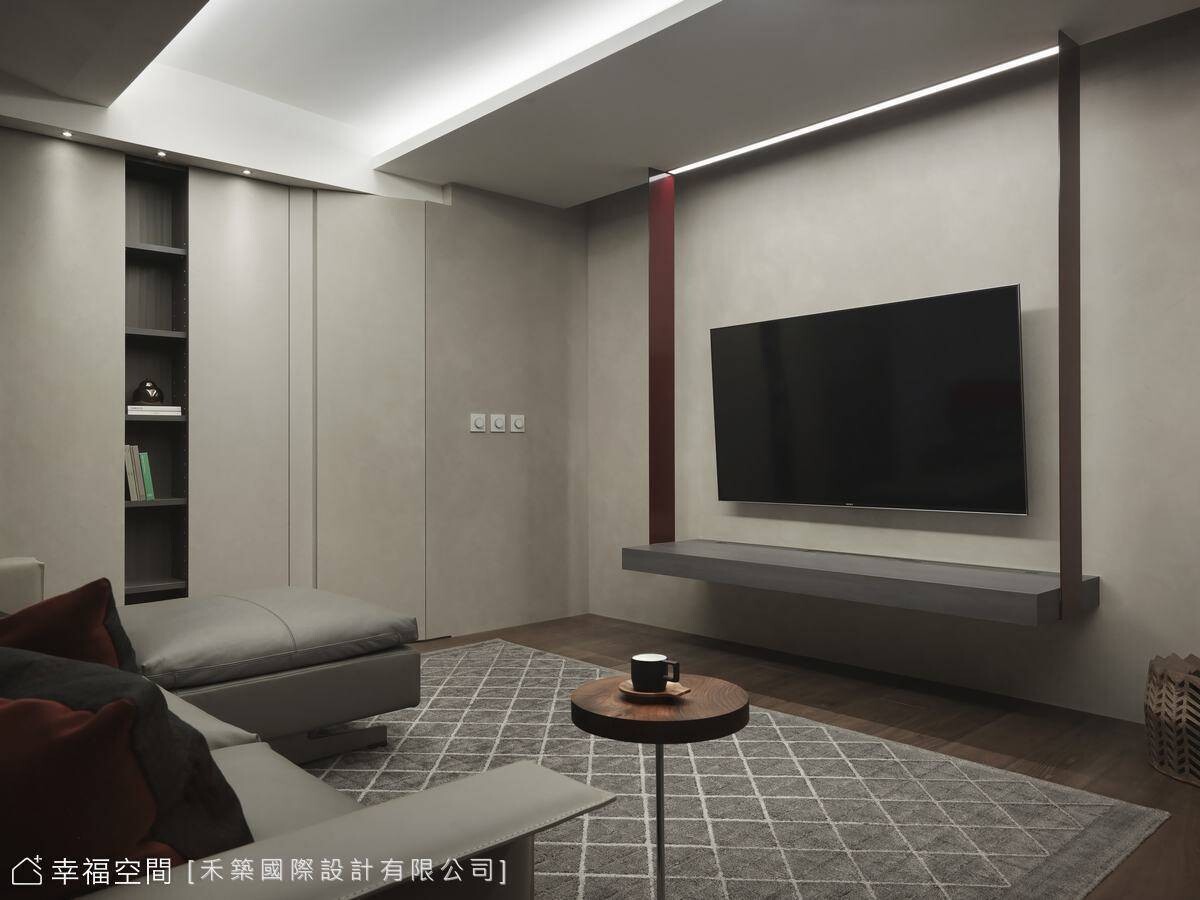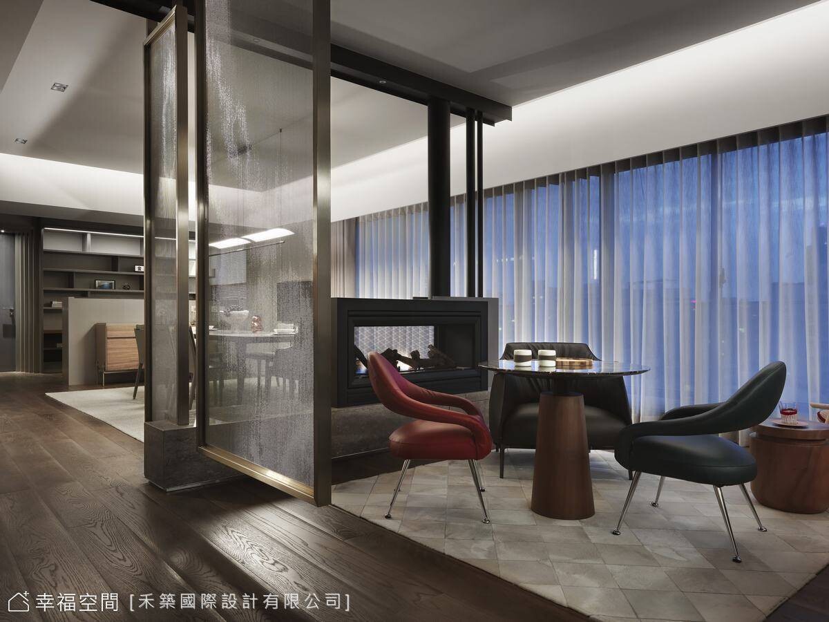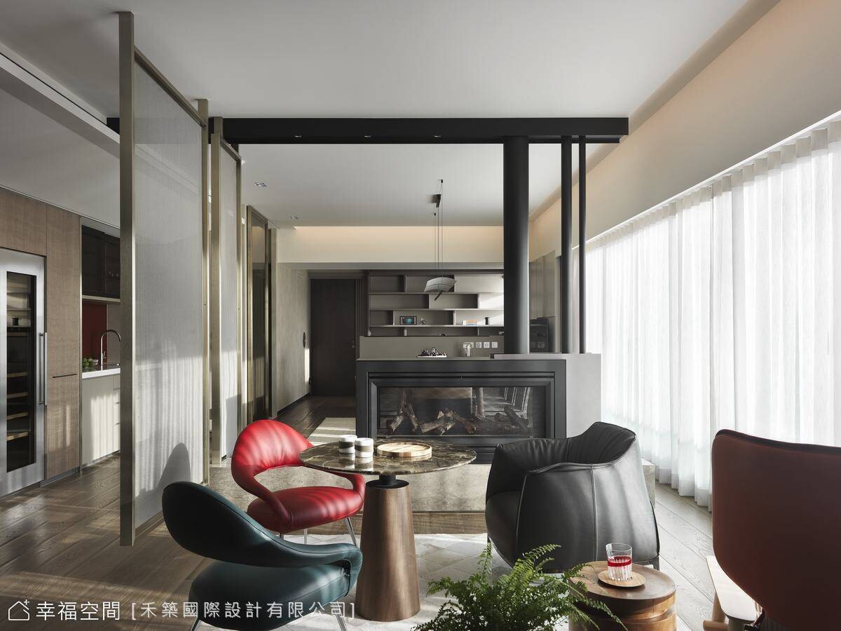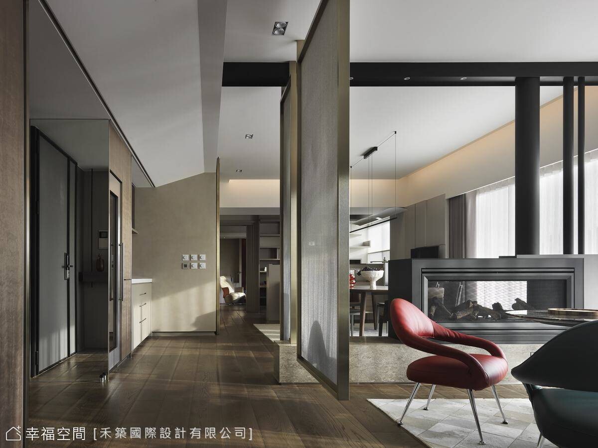 外玄關設置紅色穿鞋椅點出設計主題,大門為全新設置,具有隔音性能;入門右側訂製了置物的小抽屜,左側植入穿衣鏡以便外出整理儀容。正面大門處使用具透視性的金屬網屏風界定區域,亦讓燦亮黃昏光線得以映照於牆一側的大面金屬材質門片上,煥發縷縷流光,烘暖整個家。電視牆、廊道幔塗質樸特殊漆,氤氳人文氣息。電視以紅色鐵件吊架框構,創造輕盈感亦可收整機體線路。沙發後擺放圓桌及優雅單椅,形成賞景、放鬆的休閒聊天區。聊天區與餐廳銜接處配置了雙向暖爐,重現在紐約時的生活經驗。譚淑靜設計師為了兼顧視覺與安全性,亦在爐體上連通粗圓管排煙,細圓管圈裹控管線與電源線,再銜接上方黑色帶狀線條,與壁爐底座下緣的光帶呼應,於夜晚時營塑朦朧微醺情調。