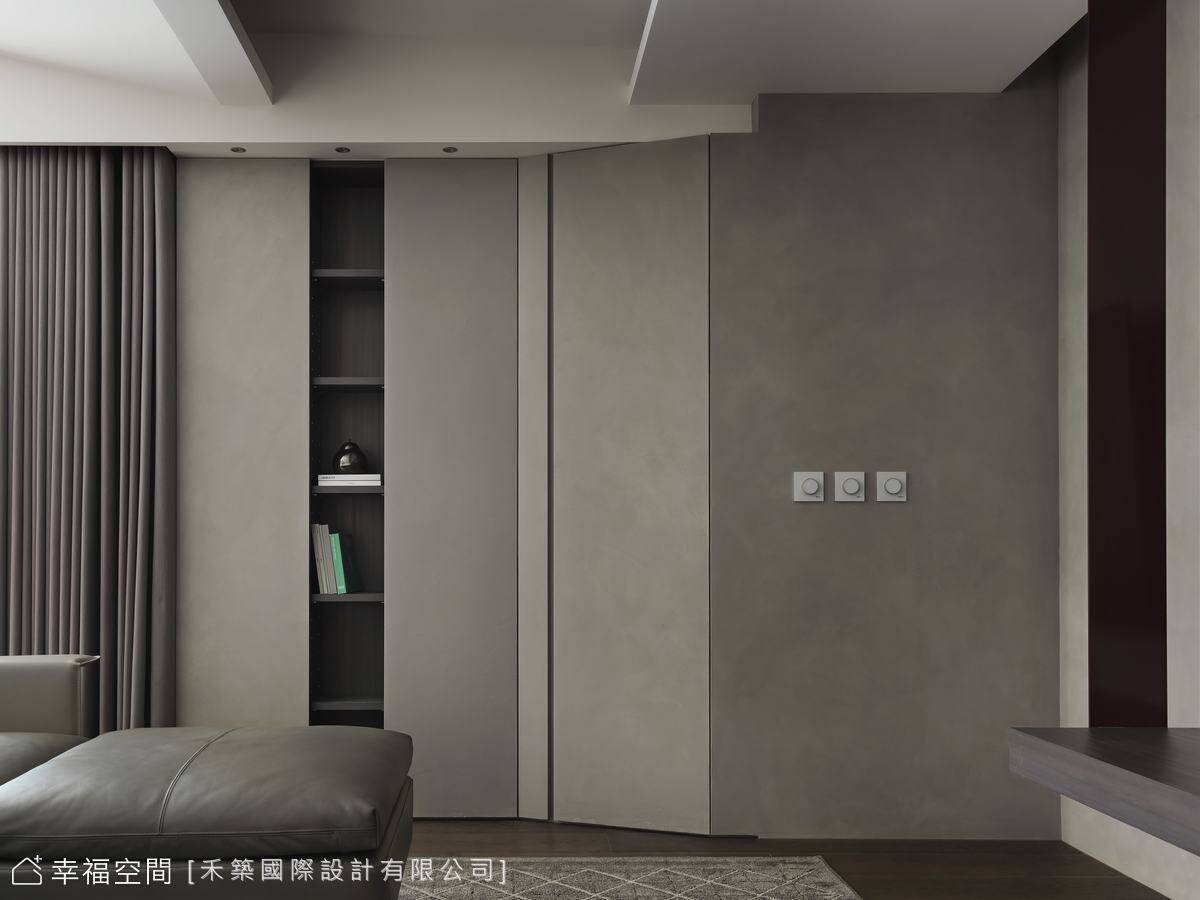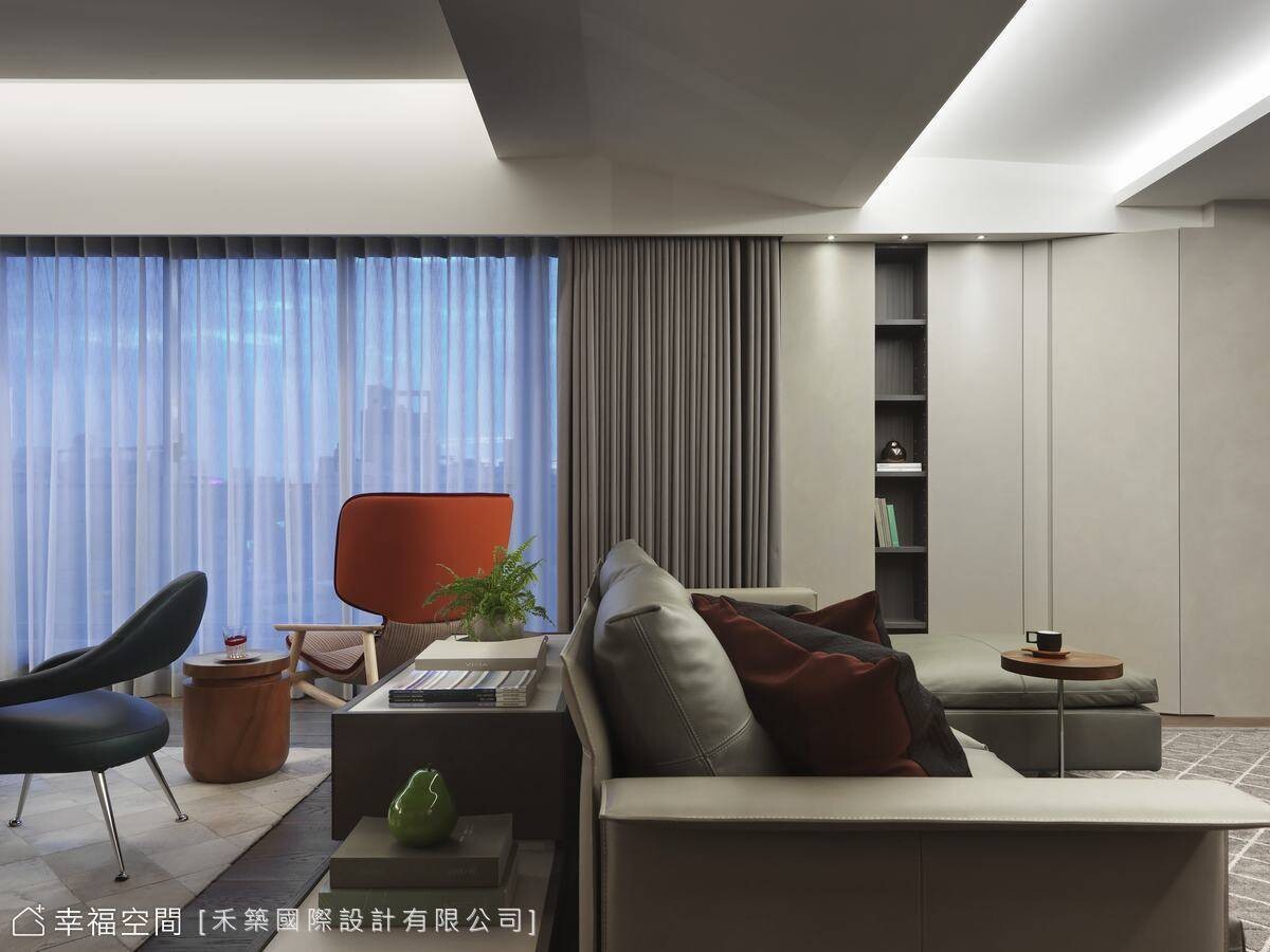 格局上考量到孩子皆已獨立,現階段僅需滿足兩人的聚會需求與日常所需,將原有的四房規劃改為三房,擴大公領域,並以妥善的設備佈局與斜板手法消弭玄關、客廳以及四周大樑帶來的突兀感,同步拉高天花板,形塑舒適無壓空間感。全室沒有制式隔間,視野通透且處處可休憩,使愛閱讀的屋主可隨心所欲坐下,探詢書中寶藏,而公區兩端則分別安置男女主人臥室,形成既獨立卻不疏離的密切關係。