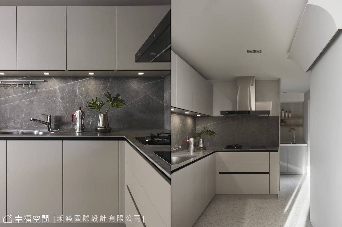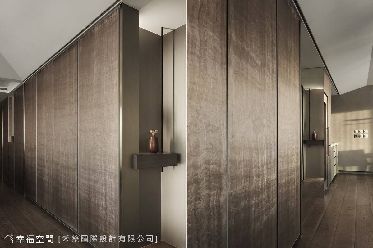 私領域雙主臥門斗採漸層階梯式造型點出層次感。男主人房走灰藍色調,內部劃分為閱讀區、睡眠區、更衣室與衛浴空間,過道的轉角被修飾為圓弧,順勢串聯場域。女主人房設有獨立衛浴及更衣室,其中透過人字拼木地板及錯落的壁布貼法,挹注柔美質韻。譚淑靜設計師以造就葡萄酒豐富口感的成分--單寧為靈感,為忙碌半輩子,終於得以享受生活的屋主夫妻,精心整頓18年中古屋,劃出順暢行跡,添佐自然元素,特調出療癒獨特的回甘家常。