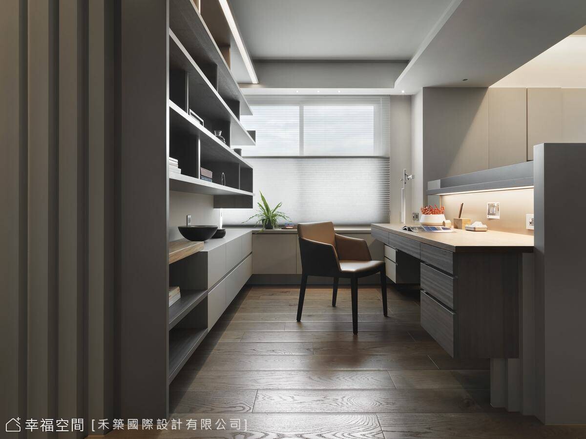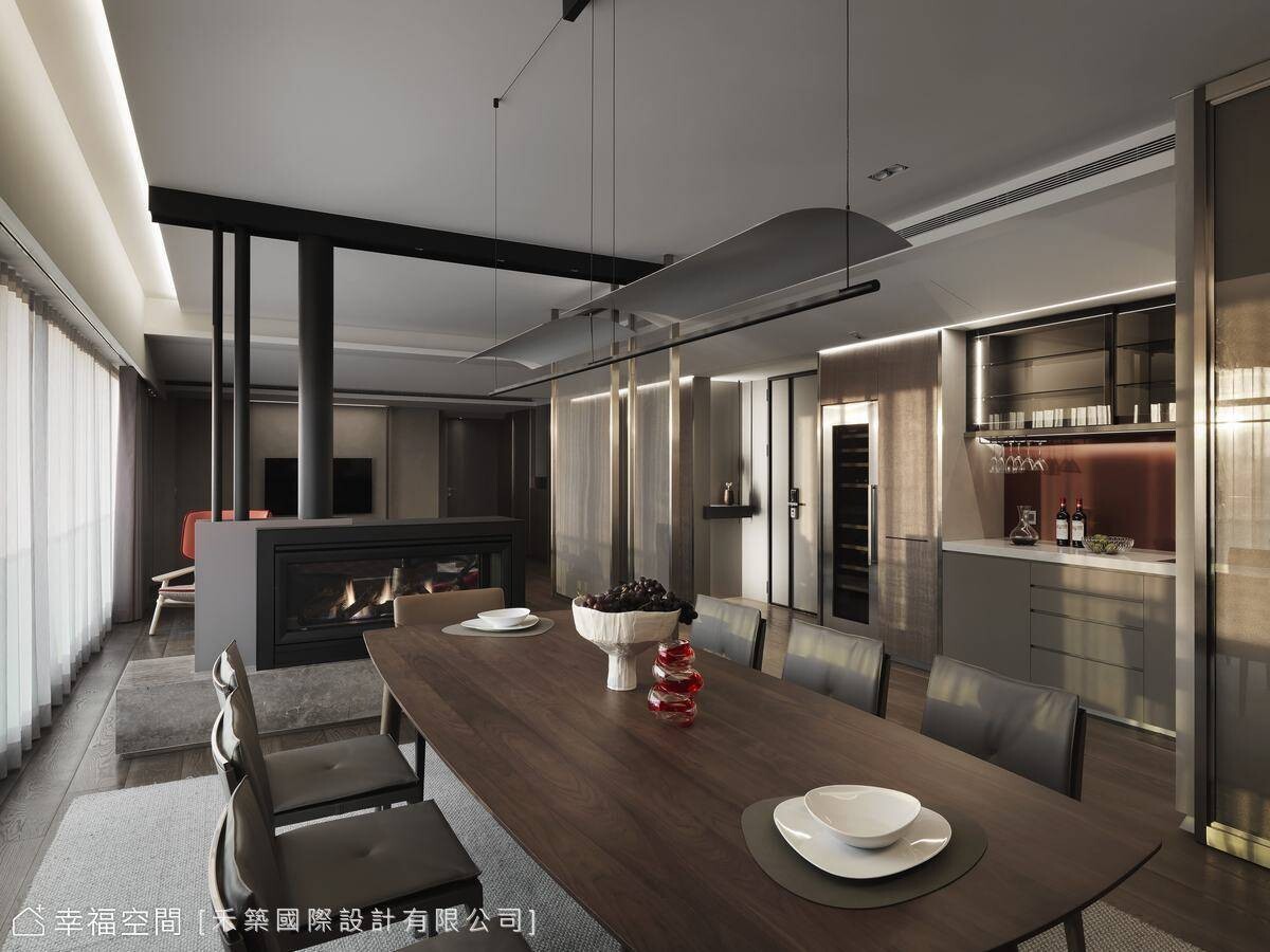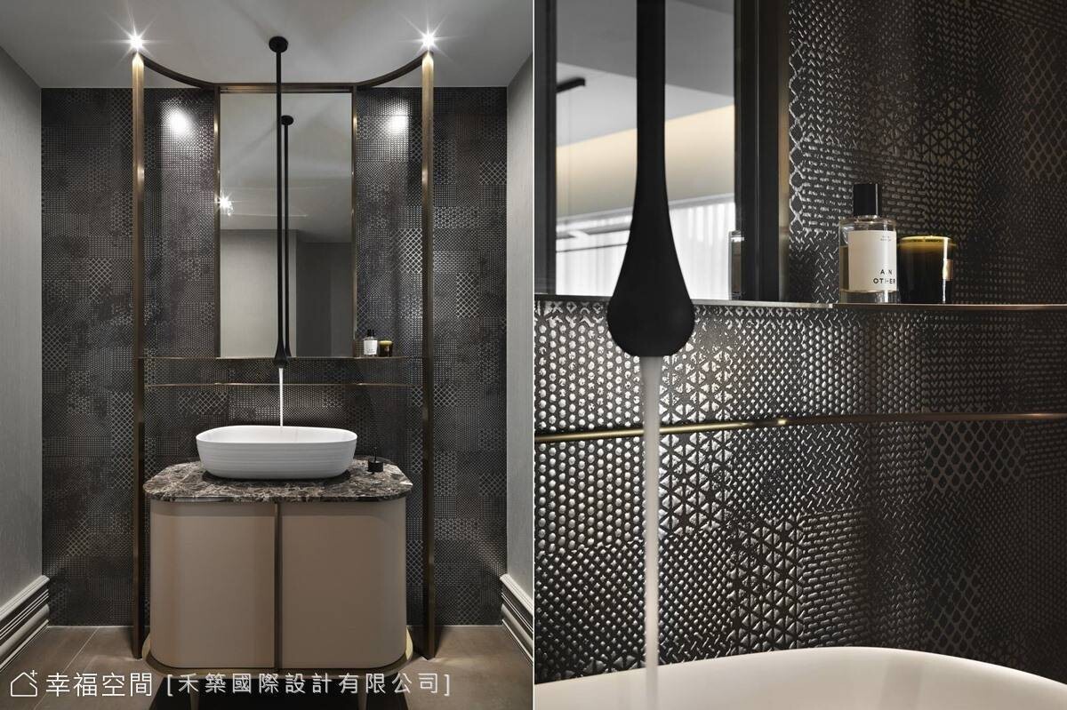 餐廳區位置鄰近紅酒冰箱與茶水櫃,繪出取酒、餐敘的流暢動線。此外,屋主希望此處也可以看電視,所以裝設了可調整角度的電視,結合隱於分割造型牆面內的收納,補足儲藏機能。客衛浴鋪展金屬黑釉特殊磚,訂製圓弧鐵架,更大膽選用自天花板垂直而下的水龍頭,共構華麗精緻畫面,使客人享有備受尊寵的愉悅感。書房特別精算高度、尺寸,訂製附有照明的矮隔屏書桌,讓男主人體驗從來沒有過的,坐在矮隔屏辦公的空間感受。
