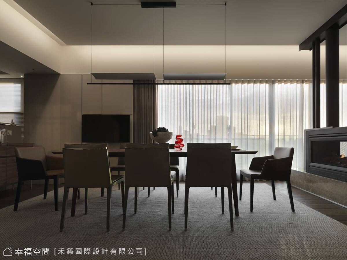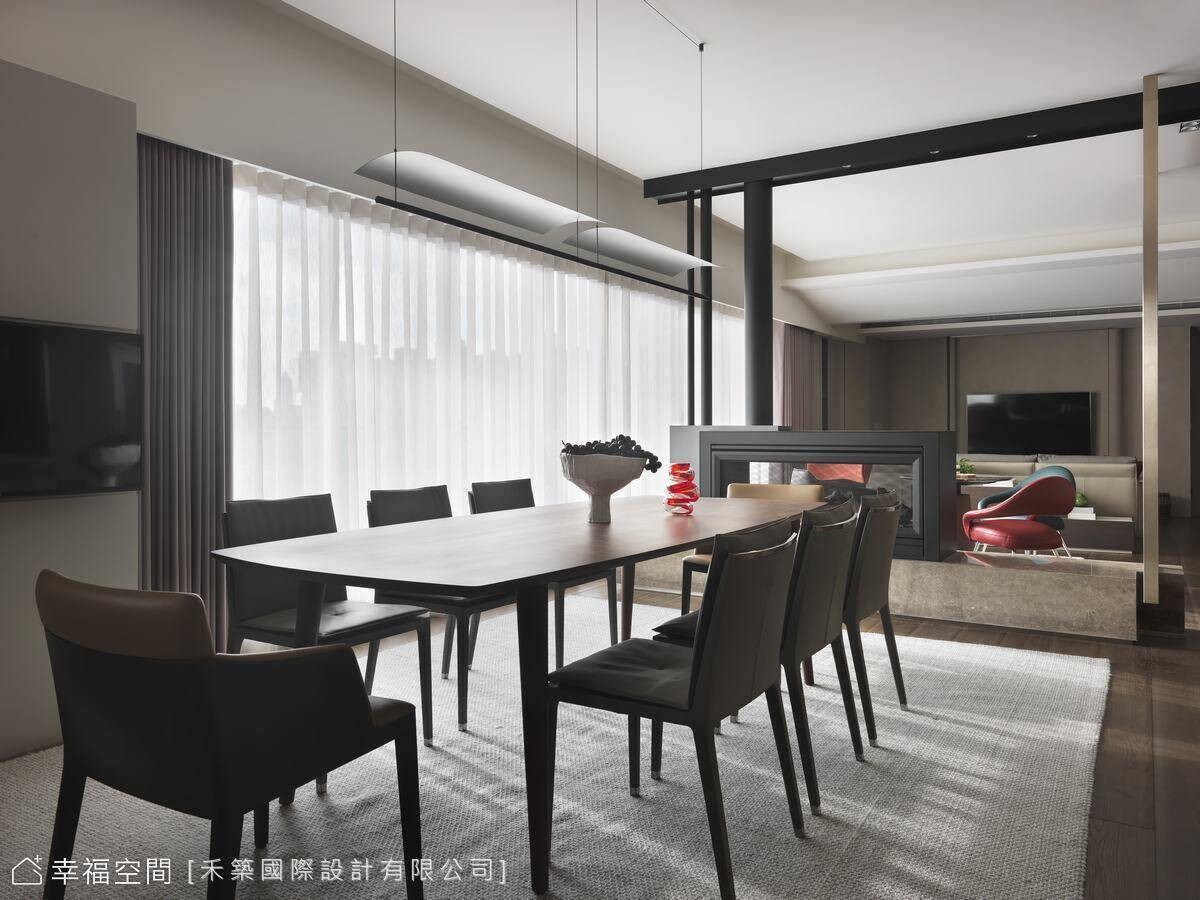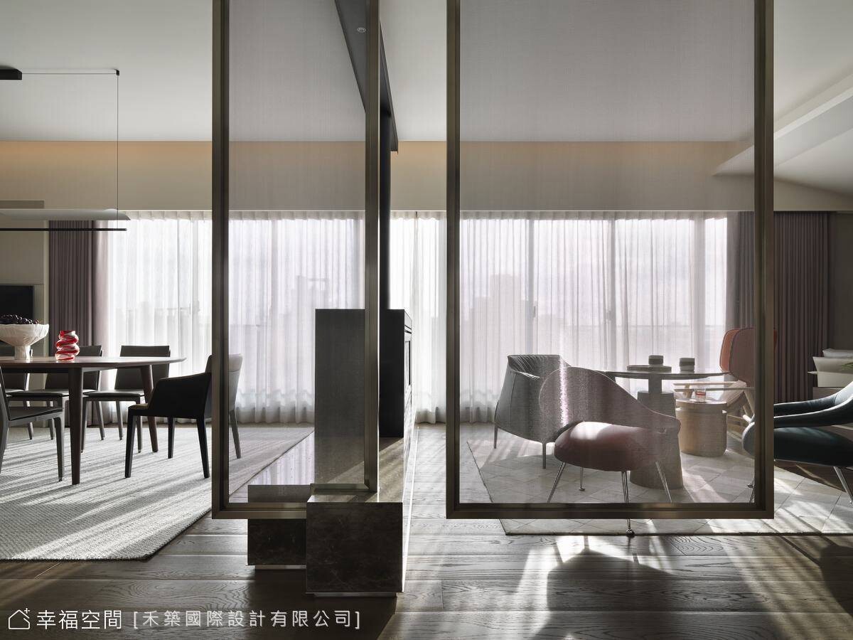 餐廳區位置鄰近紅酒冰箱與茶水櫃,繪出取酒、餐敘的流暢動線。此外,屋主希望此處也可以看電視,所以裝設了可調整角度的電視,結合隱於分割造型牆面內的收納,補足儲藏機能。客衛浴鋪展金屬黑釉特殊磚,訂製圓弧鐵架,更大膽選用自天花板垂直而下的水龍頭,共構華麗精緻畫面,使客人享有備受尊寵的愉悅感。書房特別精算高度、尺寸,訂製附有照明的矮隔屏書桌,讓男主人體驗從來沒有過的,坐在矮隔屏辦公的空間感受。