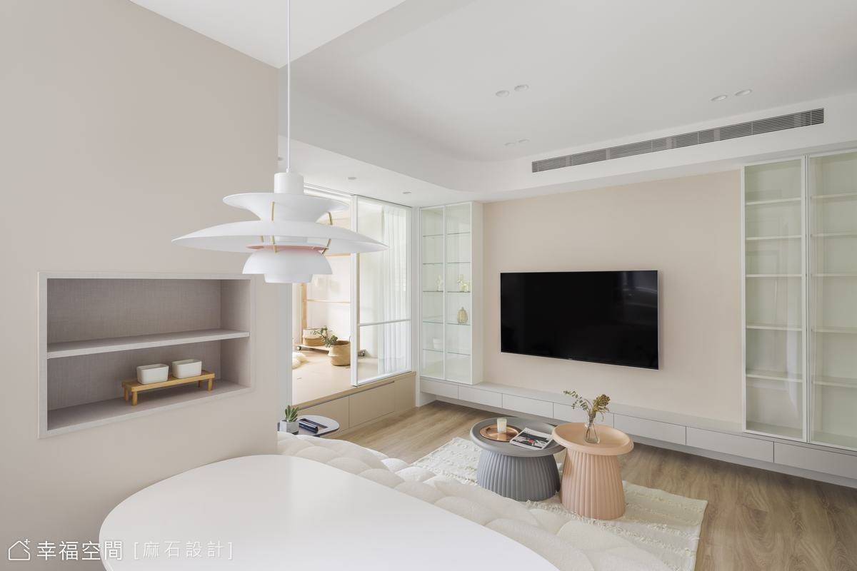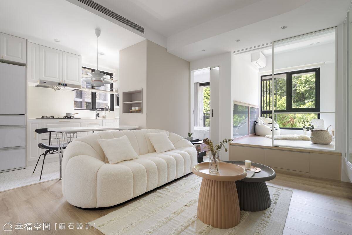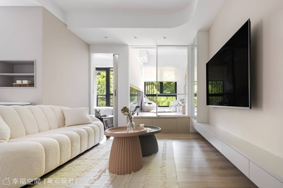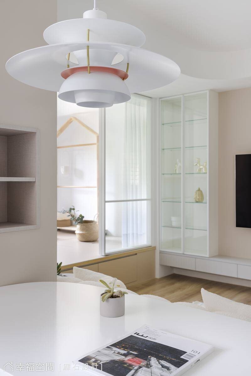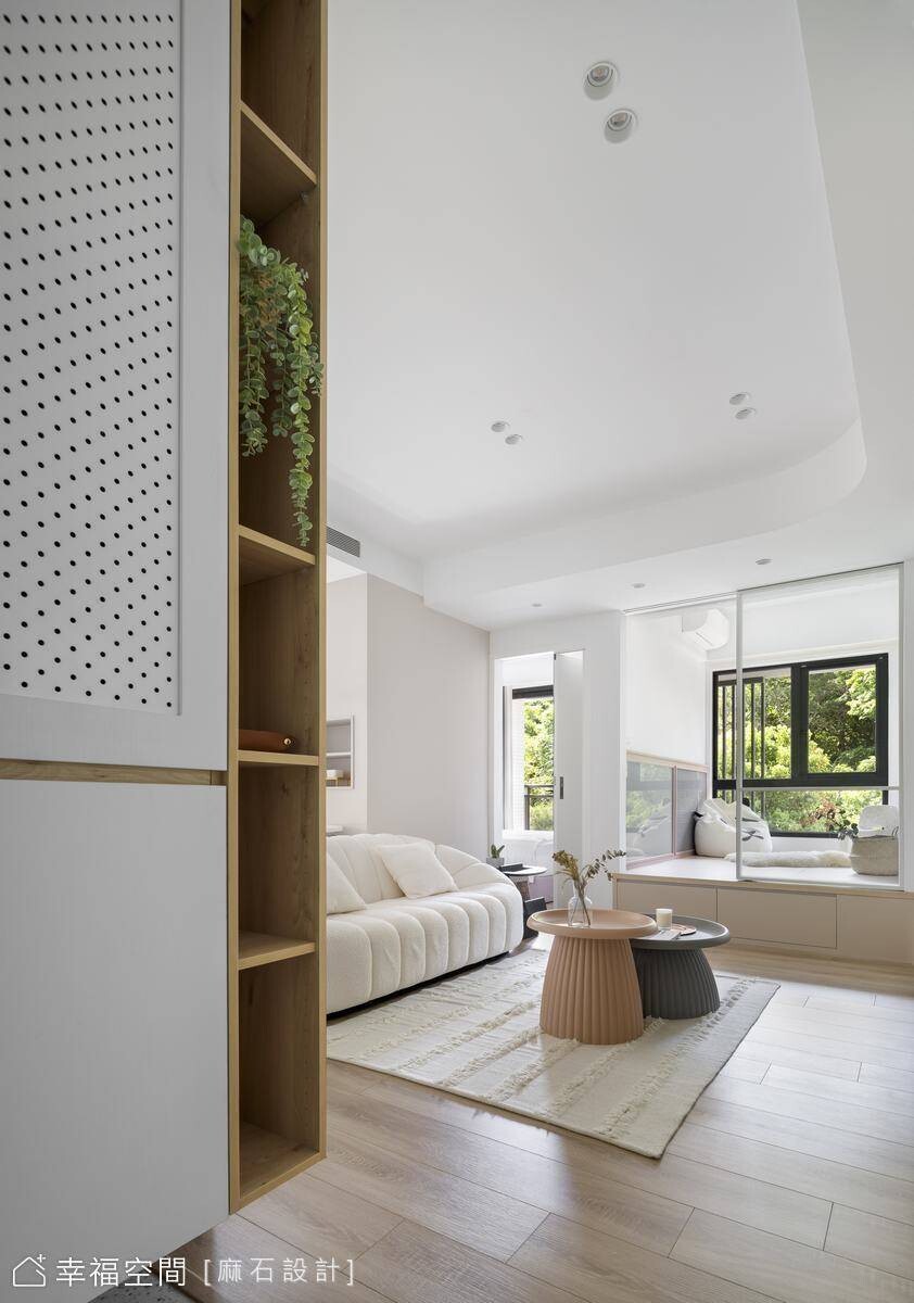 從事餐飲業的年輕屋主剛迎來嬌嫩生命,希望能給予孩子簡約、乾淨、明亮的舒適空間,也希望在有限的小坪數空間中擁有2房2廳的格局。為了讓空間保有自由度,我們規劃了多功能合室,並搭配活動家具,讓空間保有變化,也設置了一間儲藏室升級收納容積,亦善用地面架高部分植入完整收納機能,方便整理小朋友的玩具及生活必需品。劃分場域的隔間使用玻璃材質,讓視野更加開闊,也攬入豐沛採光烘暖全室!