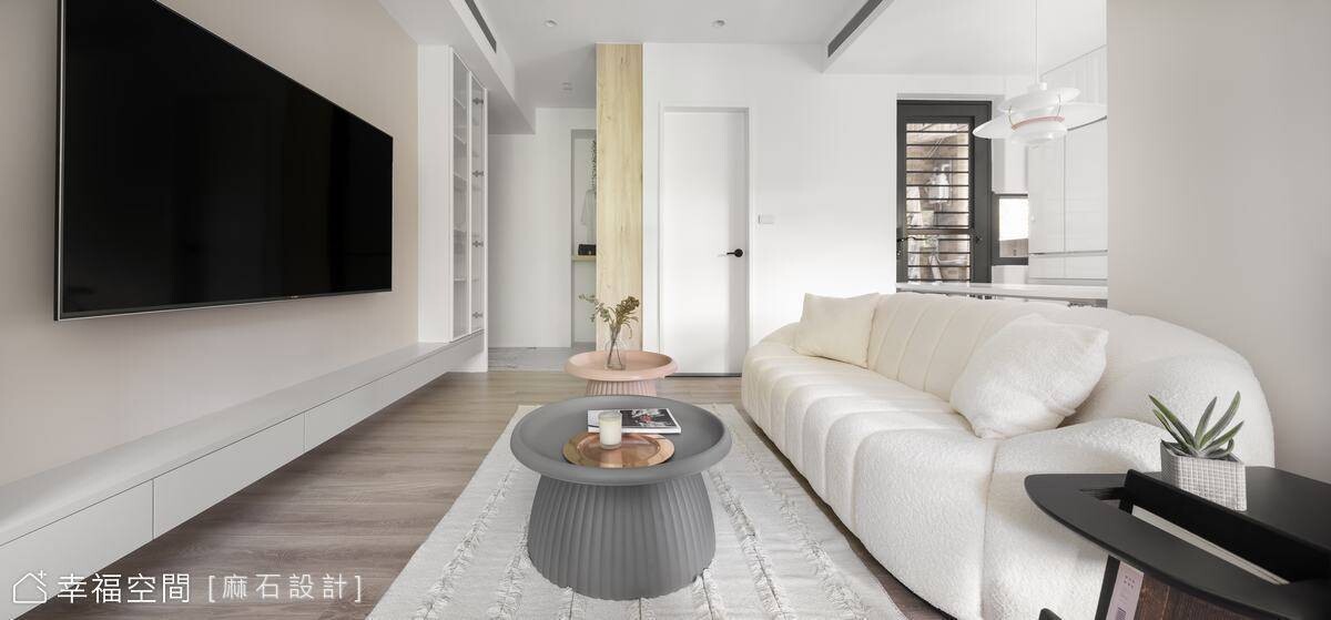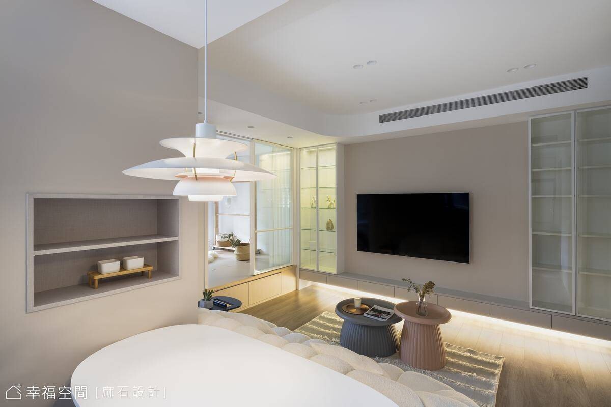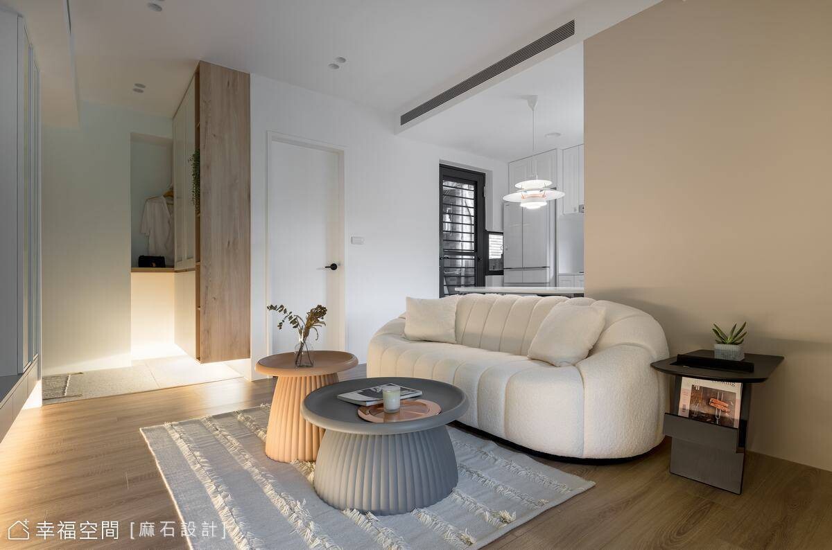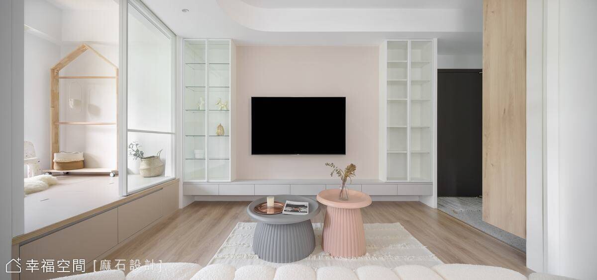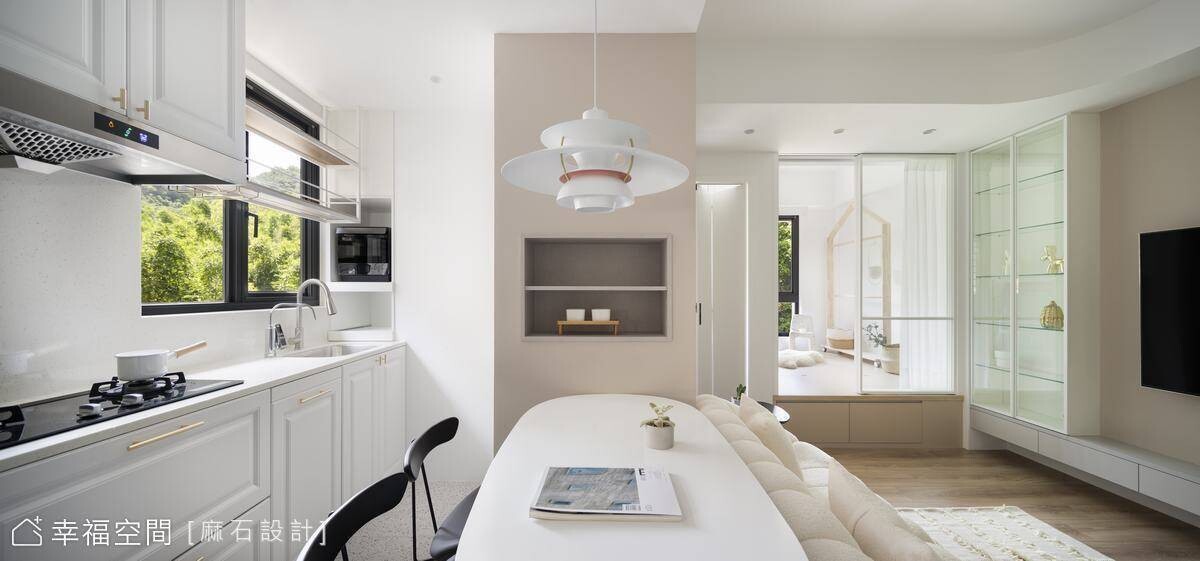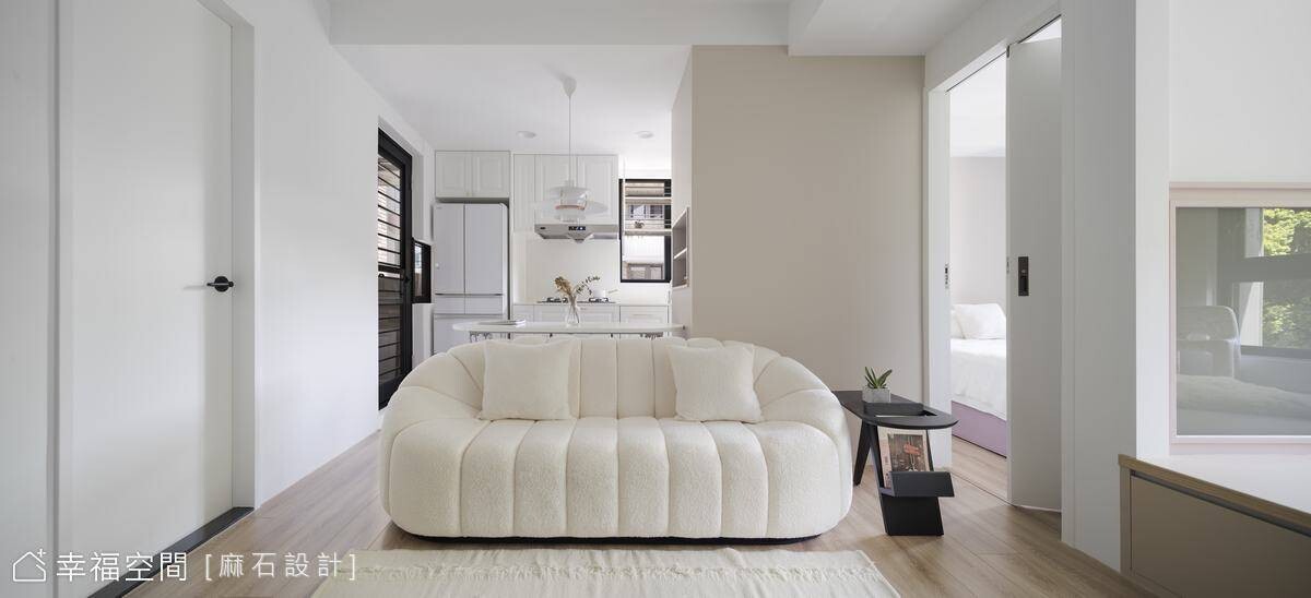 從事餐飲業的年輕屋主剛迎來嬌嫩生命,希望能給予孩子簡約、乾淨、明亮的舒適空間,也希望在有限的小坪數空間中擁有2房2廳的格局。為了讓空間保有自由度,我們規劃了多功能合室,並搭配活動家具,讓空間保有變化,也設置了一間儲藏室升級收納容積,亦善用地面架高部分植入完整收納機能,方便整理小朋友的玩具及生活必需品。劃分場域的隔間使用玻璃材質,讓視野更加開闊,也攬入豐沛採光烘暖全室!