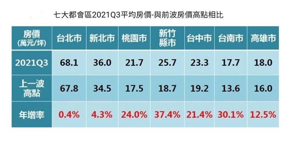 國內在疫苗施打覆蓋率逐步提升的狀況下,疫情有趨緩的跡象,有助於房市信心回溫,永慶房產集團業務總經理葉凌棋表示,隨著購屋需求增溫,七大都會區房價都呈現上漲趨勢,以近一年的房價來觀察,自2020年第三季至2021年第三季各季的房價變動來計算年度累積漲幅,可以發現除了雙北市外,其餘五大都會區年度累計漲幅均超過一成,而新竹、台南年度累積漲幅逾二成最多,顯見近一年國內房價漲勢明顯。