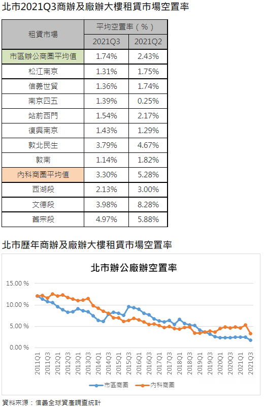今年到目前產業歷經了國內外疫情、國際經濟變動,這些對企業影響程度,商辦市場的空置率或可看出一些端倪,依據信義全球資產公司最新統計,台北市市區辦公商圈空置率已降至2%以下,來到1.74%,為歷年新低。內科商圈空置率也降至3.3%,呈現西湖、文德、舊宗段皆搶手的狀況。新供給銜接不及、企業需求動能多元且強勁、屋主在疫情考量下提高續租態度,都是帶來低空置率的主因。