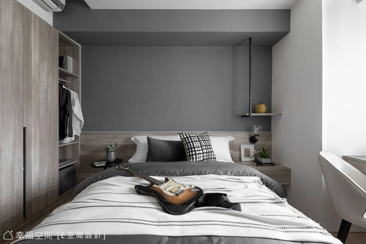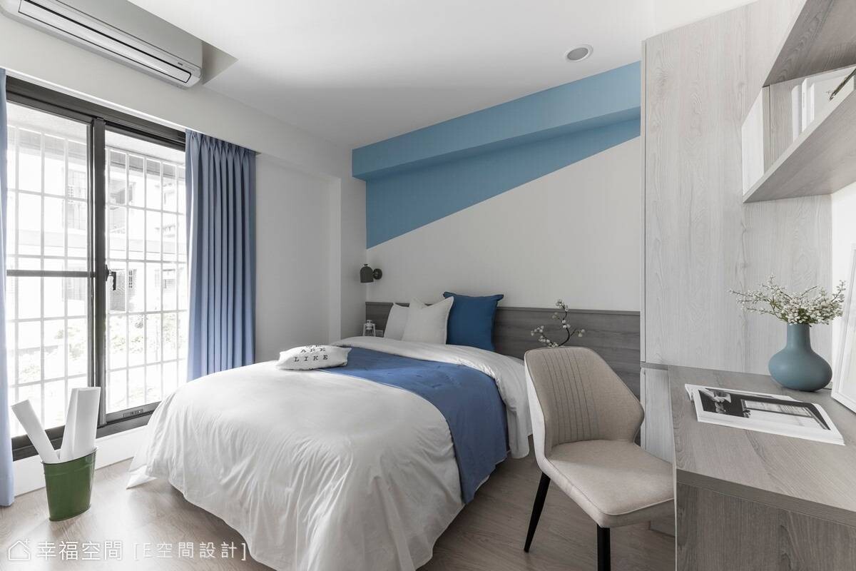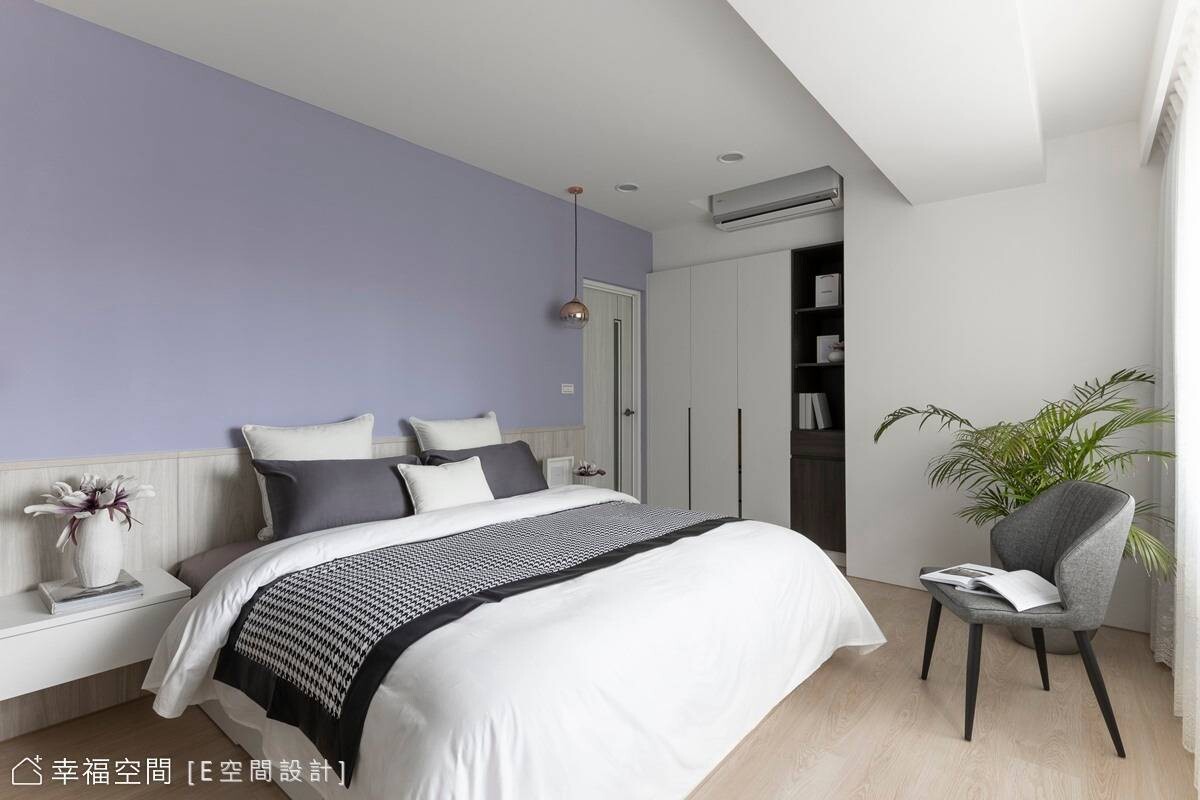 寬敞的主臥房擁有大面窗戶,引入溫煦日光搭配藕紫色調牆面,圍塑柔和睡眠氛圍,另兩間男孩房則依據個性、喜好,一間選擇灰色牆面搭木質櫃體,另一間以藍色為主軸,呈現各具特色的寢室風情,共築和諧融洽家庭,譜畫出簡單又暖心的生活環境。