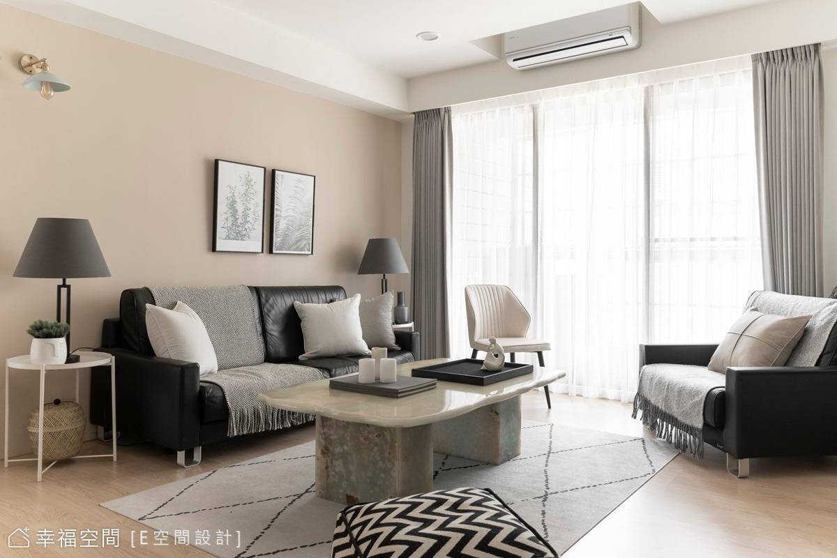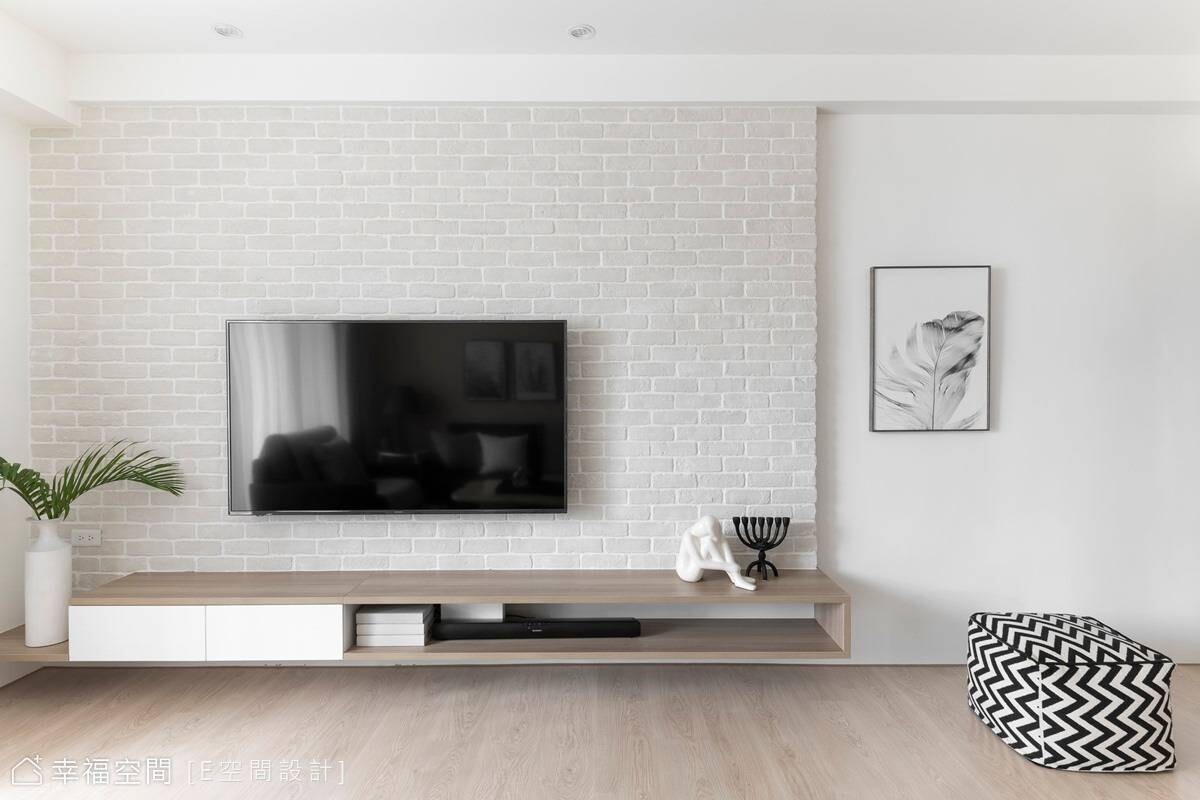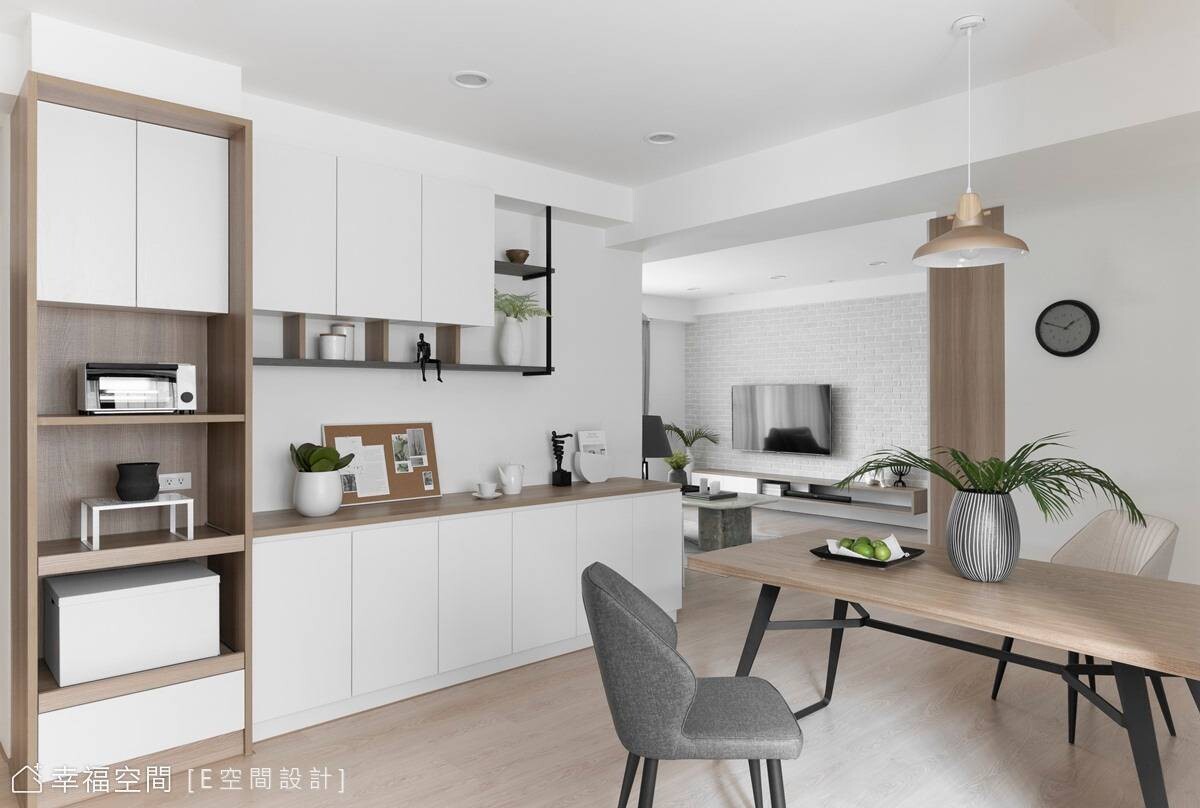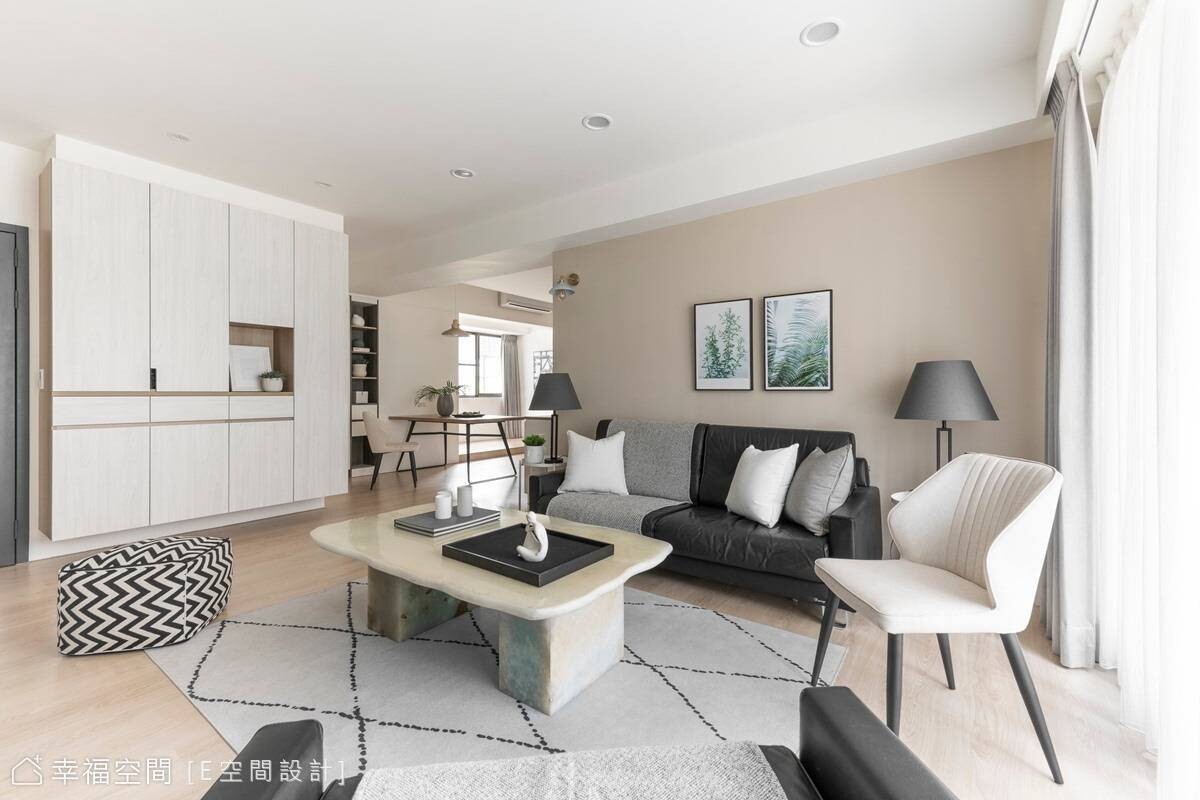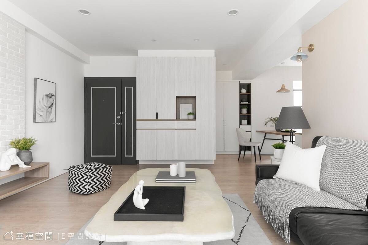 本案是15年的舊屋,因屋主鍾情現代簡約風格的居家,經由E空間設計全權擘劃,創造開放式公共場域,鞋櫃與客廳電視櫃一致為淺木色系列,串連起日光、視覺,讓整個空間活潑許多,搭配深黑色沙發帶來沉穩樸實感受,營造自然舒服的居家氛圍。