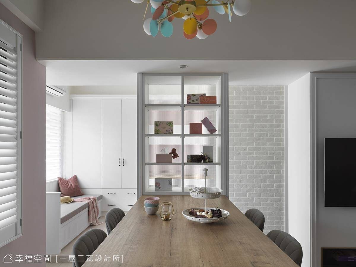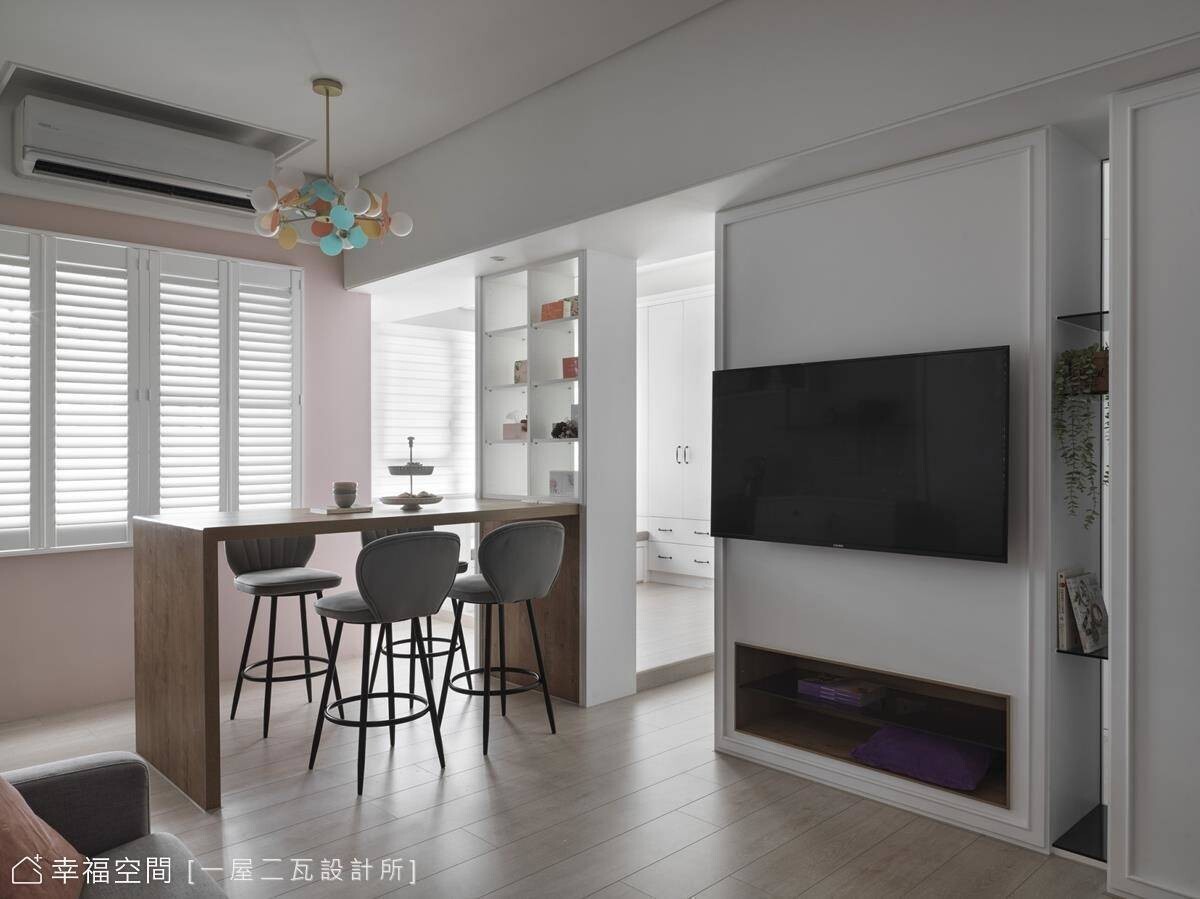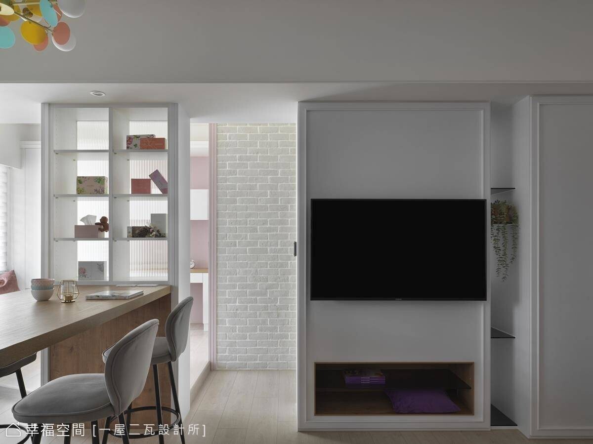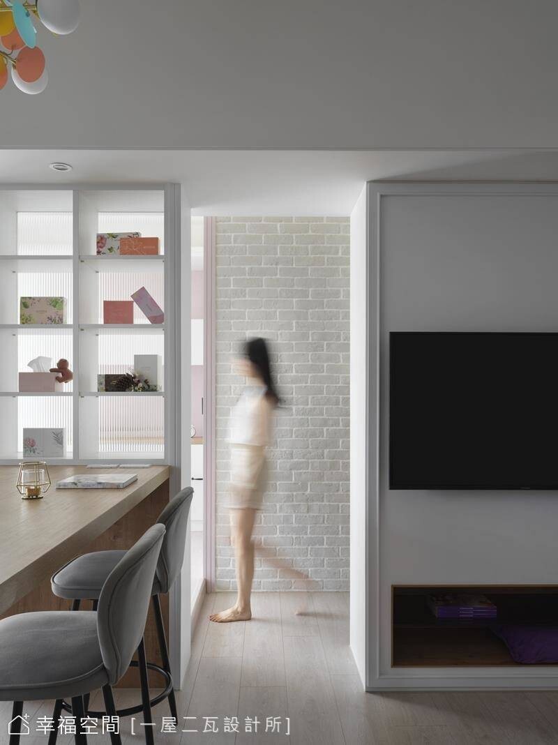 步入電視牆後方廊道,可發現電視牆背後有大容量的收納櫃,加上餐桌端底的玻璃展示櫃設計,除了收納性十分強大之外,也完美化解了主樑橫過屋心中間的壓迫感。柔美舒適的氛圍,精準運用每個角落,完美打造出女主人心中的夢想天地,是認真專注的工作室,是招待朋友來說笑談天的會所,是帶孩子們前來週末假期的渡假屋,更是她身心靈沉澱放鬆的專屬世界。