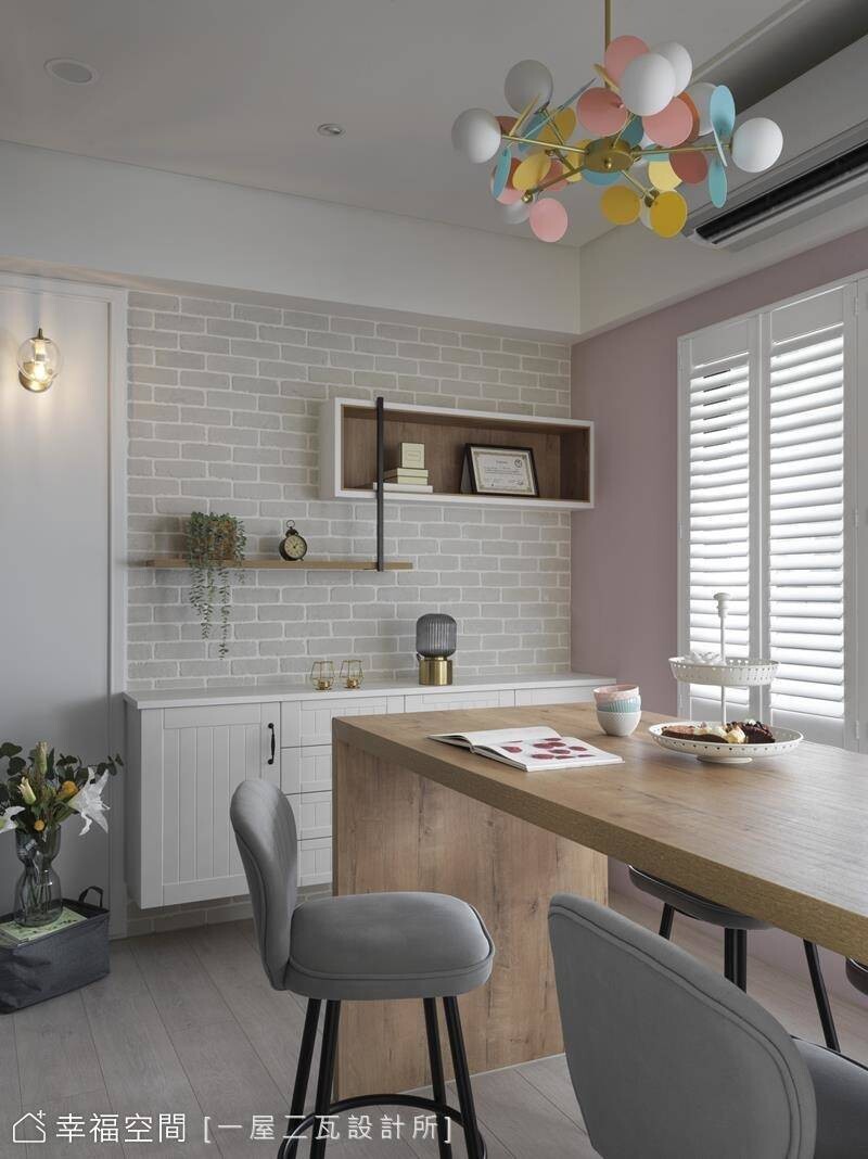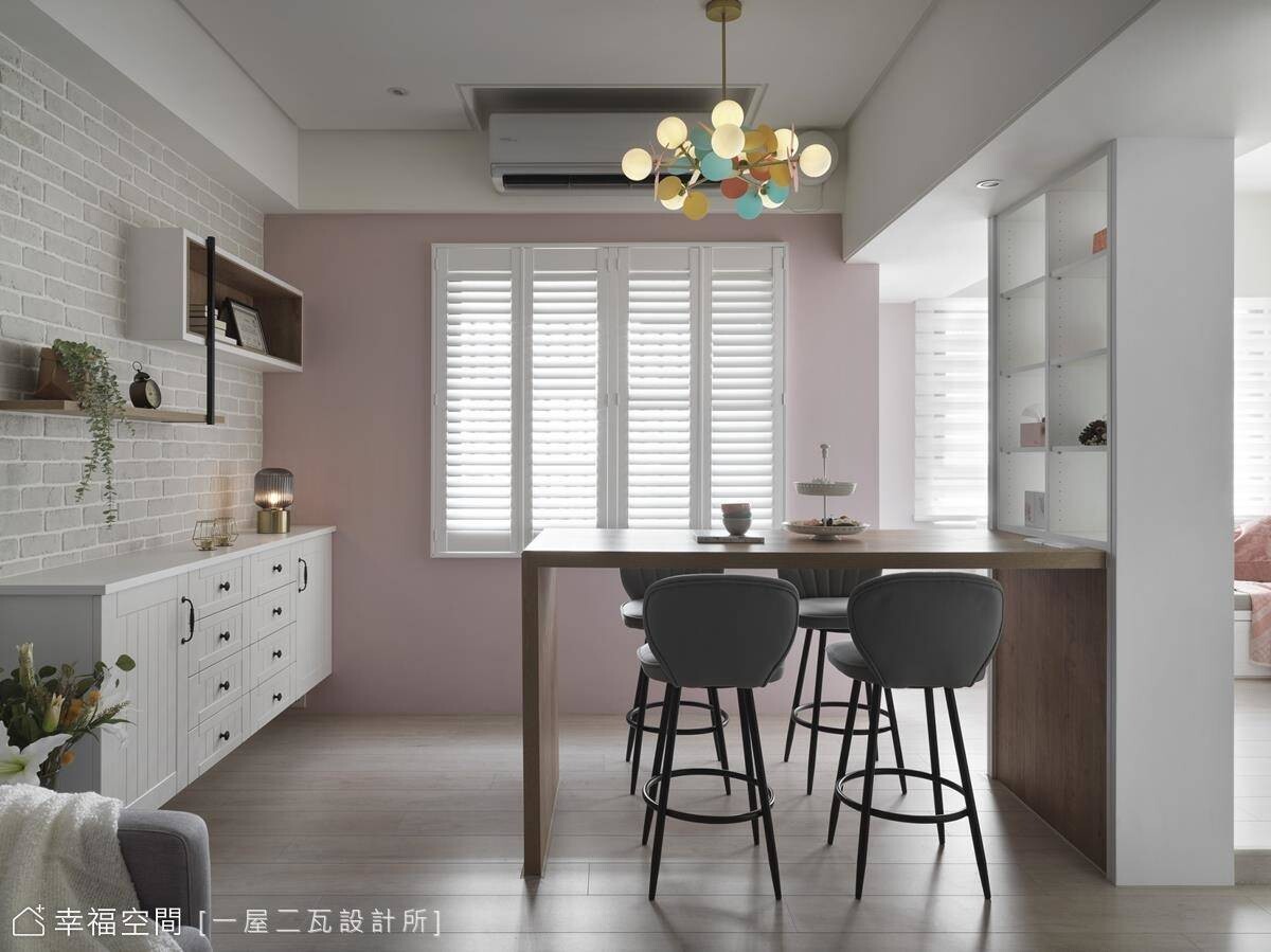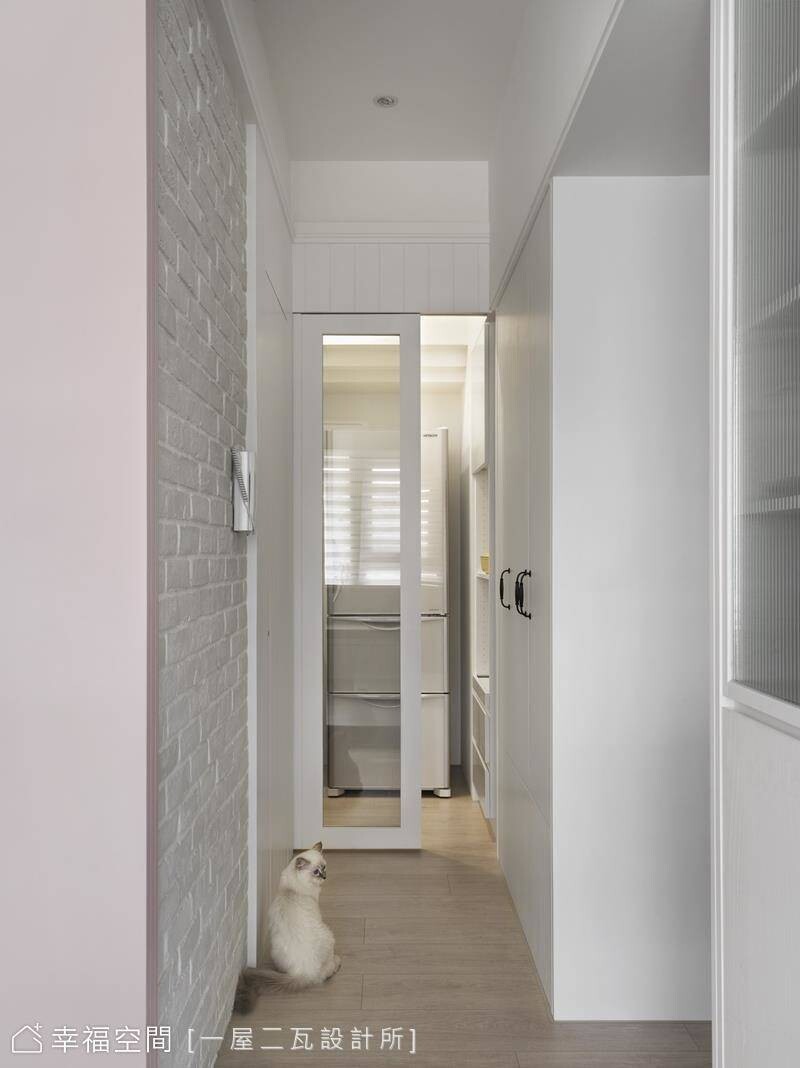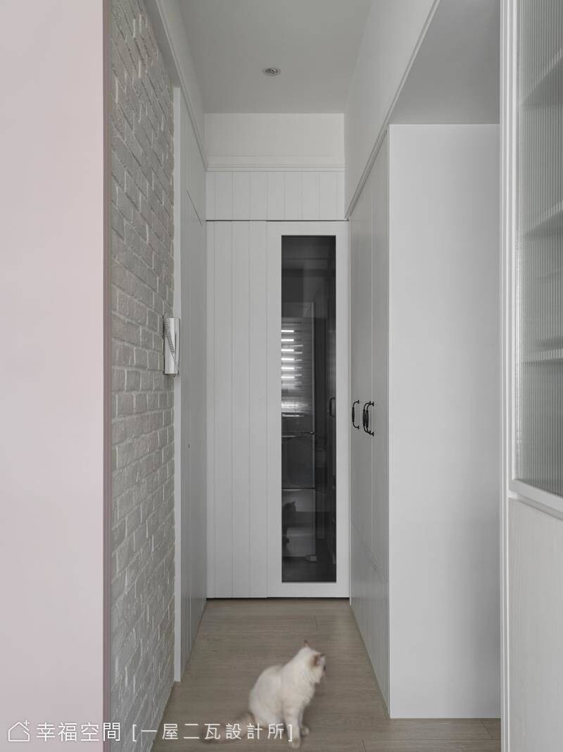 步入電視牆後方廊道,可發現電視牆背後有大容量的收納櫃,加上餐桌端底的玻璃展示櫃設計,除了收納性十分強大之外,也完美化解了主樑橫過屋心中間的壓迫感。柔美舒適的氛圍,精準運用每個角落,完美打造出女主人心中的夢想天地,是認真專注的工作室,是招待朋友來說笑談天的會所,是帶孩子們前來週末假期的渡假屋,更是她身心靈沉澱放鬆的專屬世界。